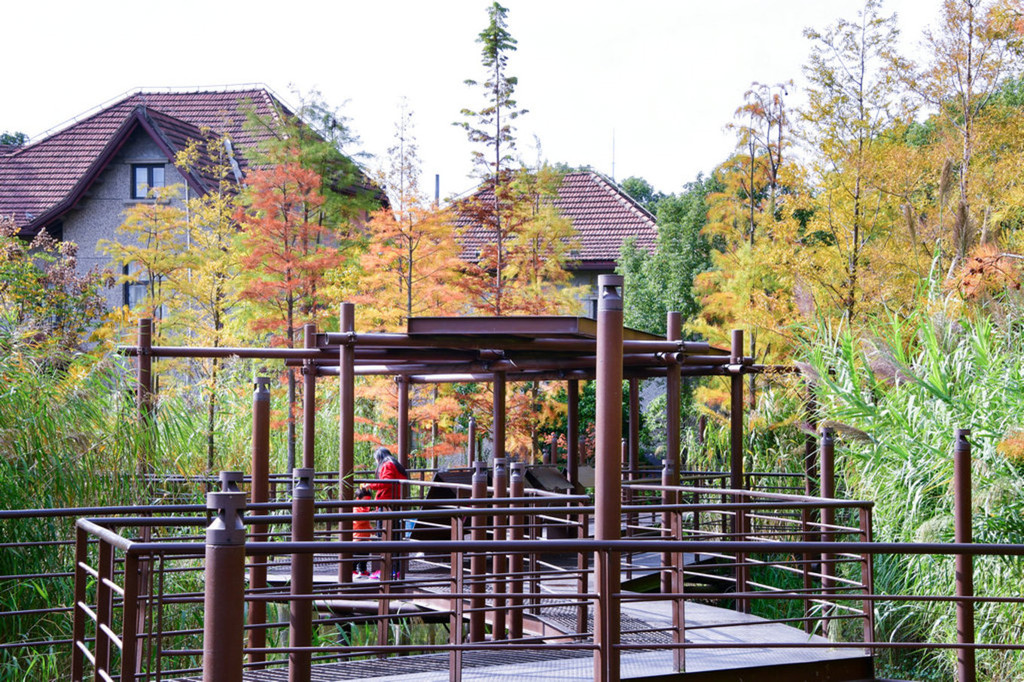 陆域部分的西侧原为生产区与辅助区,设计以原始墙基为线索,砌筑红砖矮墙,还原历史空间格局,形成半开半合的庭院;同时通过浮起的钢栈道连通各处,达到移步换景的效果。东侧部分由原生产车间中压水解楼及污水净化池(调节池、格栅池、生物转盘池、气浮池、次氯酸钠池、观测楼)组成。