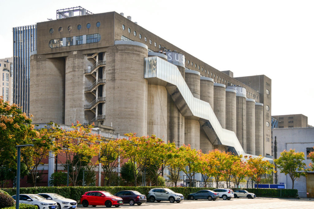 八万吨筒仓艺术中心遥望而去,八万吨粮食筒仓散发着与大 上海 摩登感极具反差的粗放的气场。30个大筒组成长140米、高48米连续而厚重的立面,气势磅礴。远观,老旧孤独的仓储库房寂静守立江畔,没了当年的辉煌,却多了份历史的沉淀和沧桑。