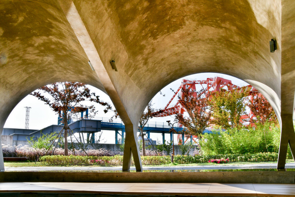 杨树浦路1900号,原址为电站辅机厂西厂一处车间。将原车间厂房钢屋架整体保留使其成为內外通透的景观构架。这就成了现在的大桥公园驿站。