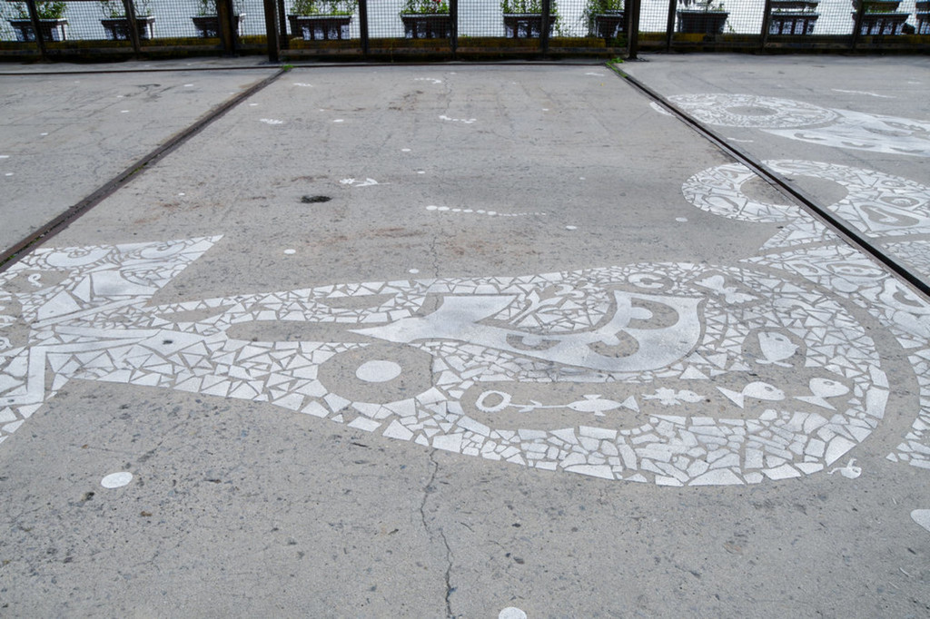 来自 日本 艺术家浅井裕介的作品《城市的野生》,这是一件“烫染”在地上的大型作品,艺术家先用马克笔在胶带上绘制植物、动物等各种图像,再运用类似绘制斑马线的白线材料将所绘图形如刺青般的画刻在场所中。