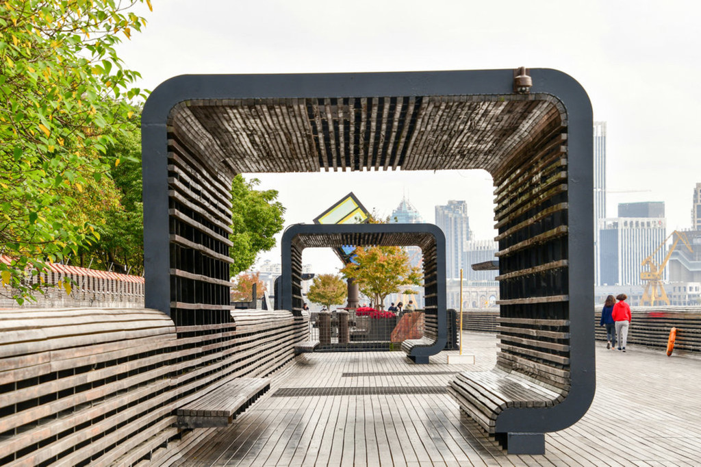 栈道上的“箱亭框景”,钢结构翻折形成箱型凉亭,成为栈桥上一个遮阳点,从一侧望去,滨江景色尽收框中,其效果如同一个相机“取景框”。