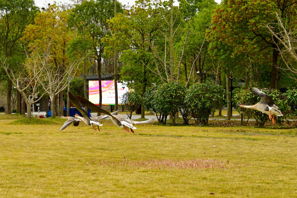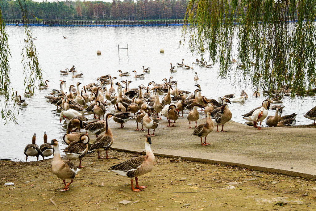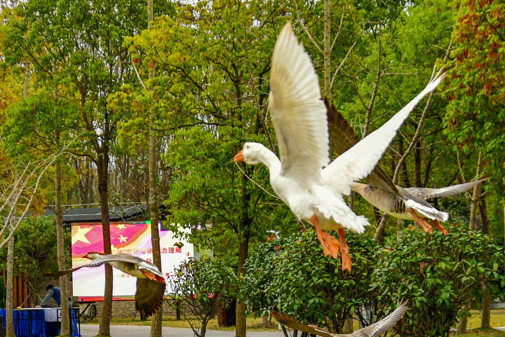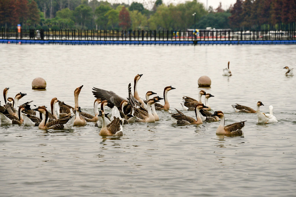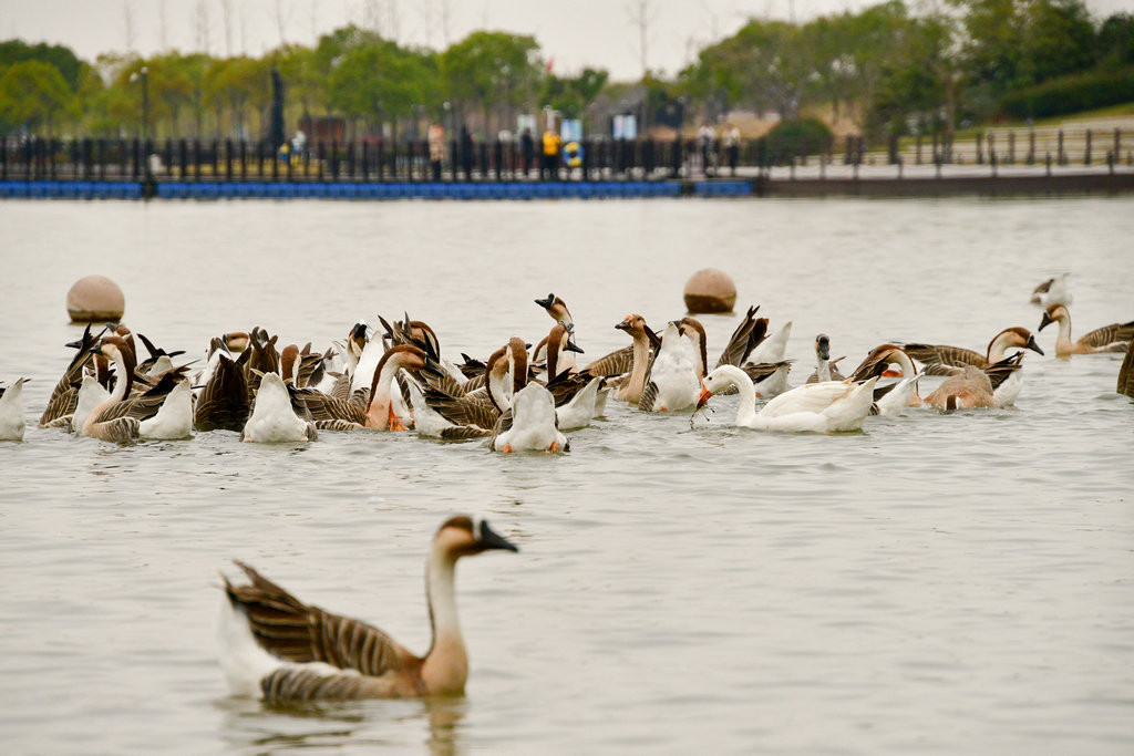 崇明明珠湖公园。公园一处偏僻角落,围网圈围起来的一片树林里,成群的“鹅”在吃食,发出嘎嘎的叫声。