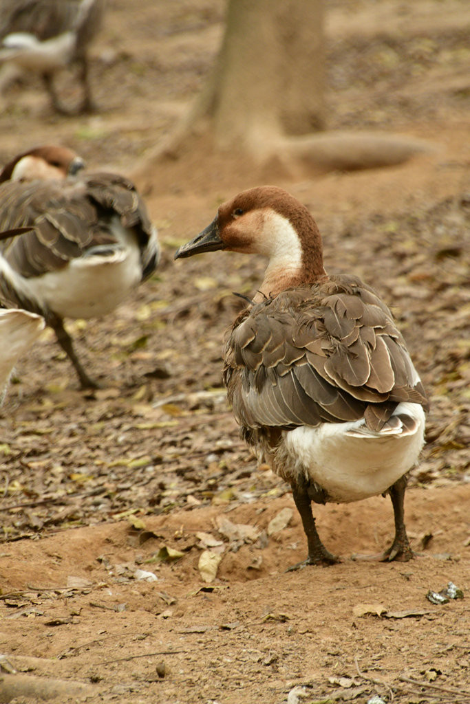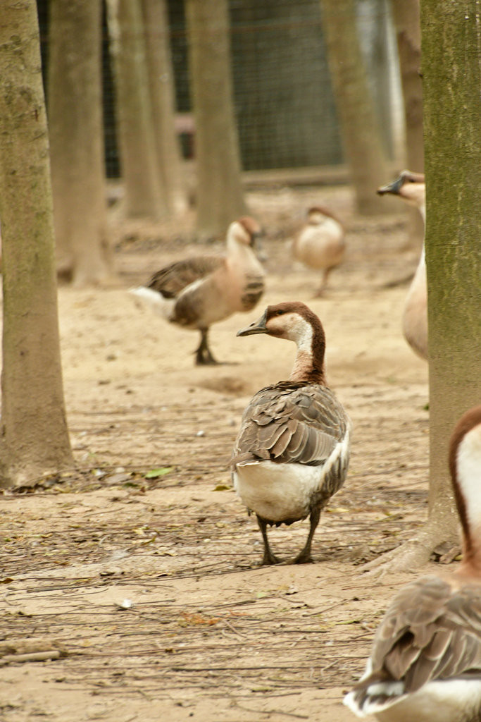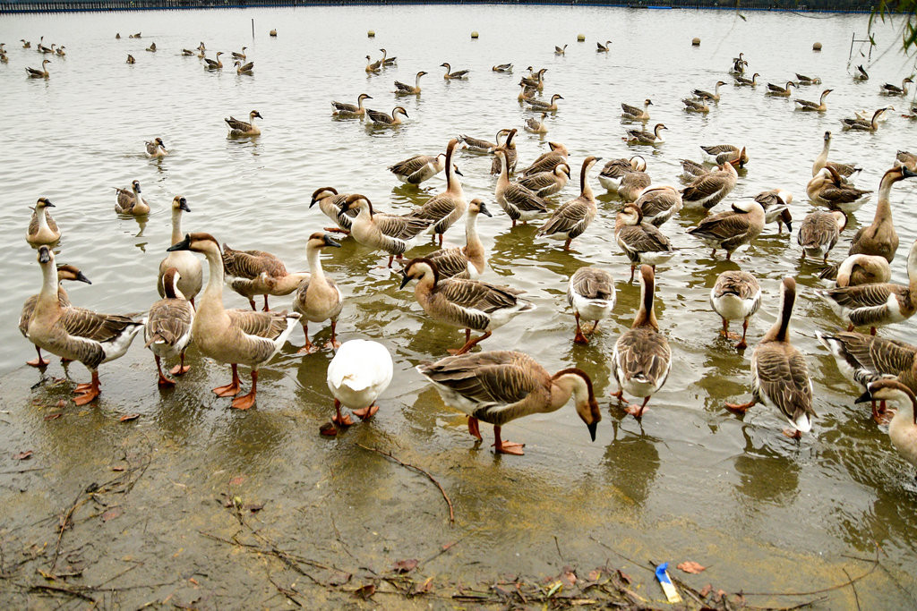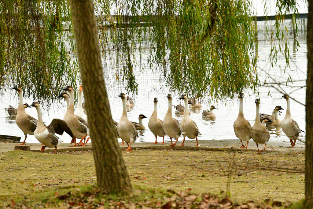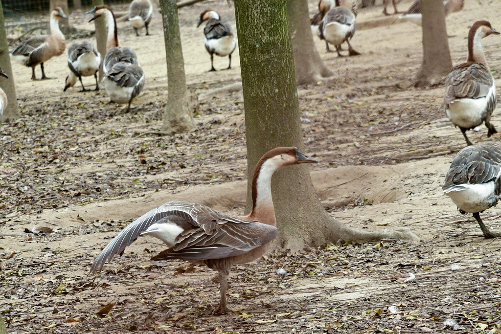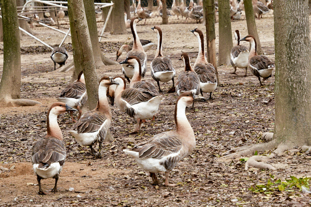 崇明明珠湖公园。公园一处偏僻角落,围网圈围起来的一片树林里,成群的“鹅”在吃食,发出嘎嘎的叫声。