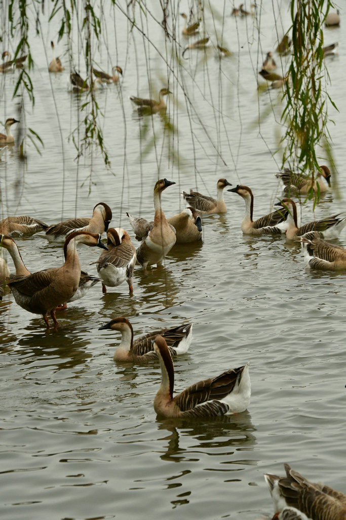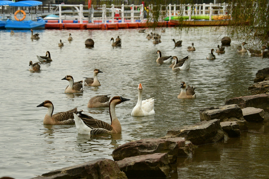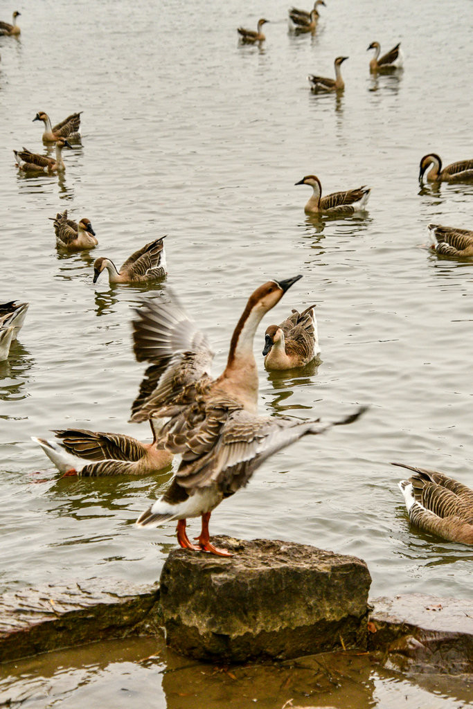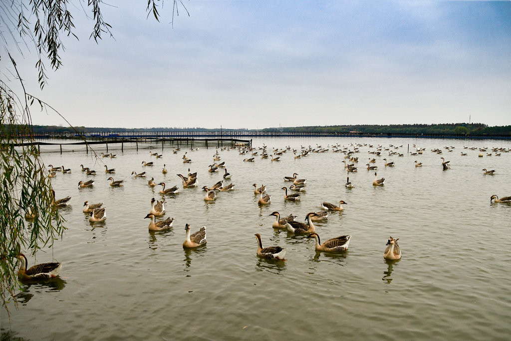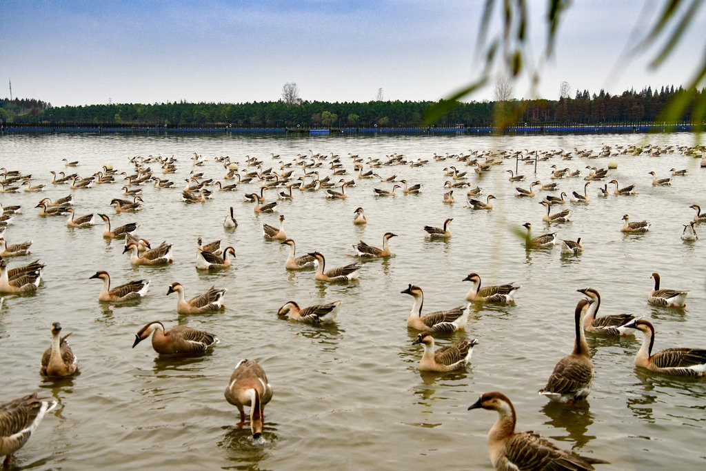 原本稍显平静的湖面,因为有了大雁悠游而灵动起来。