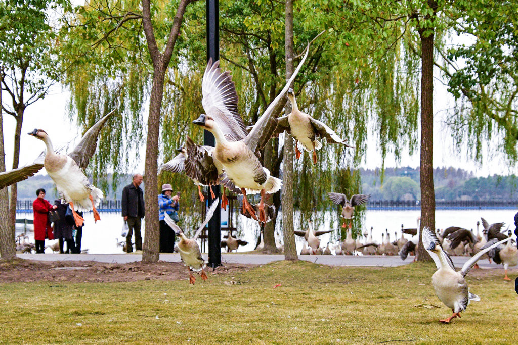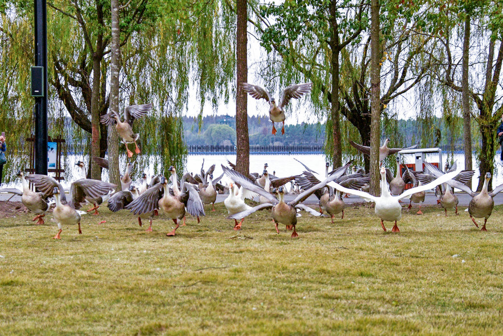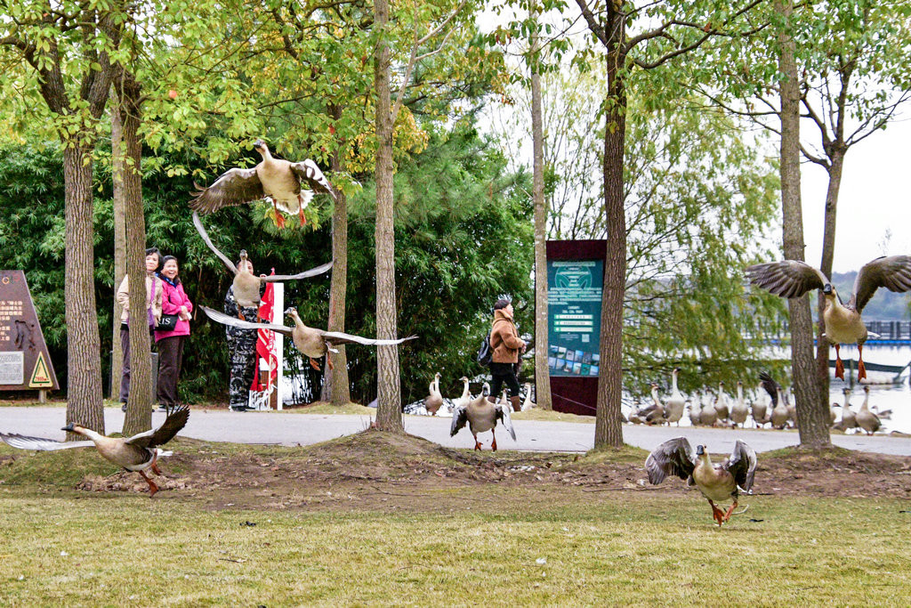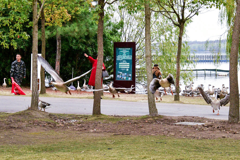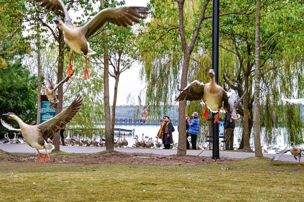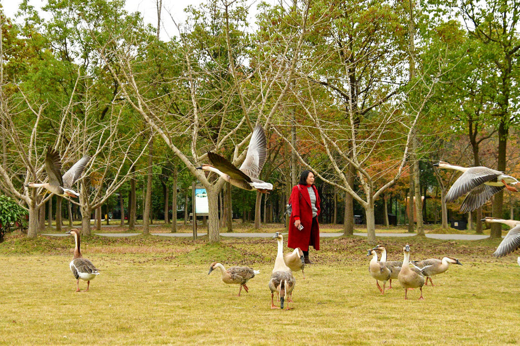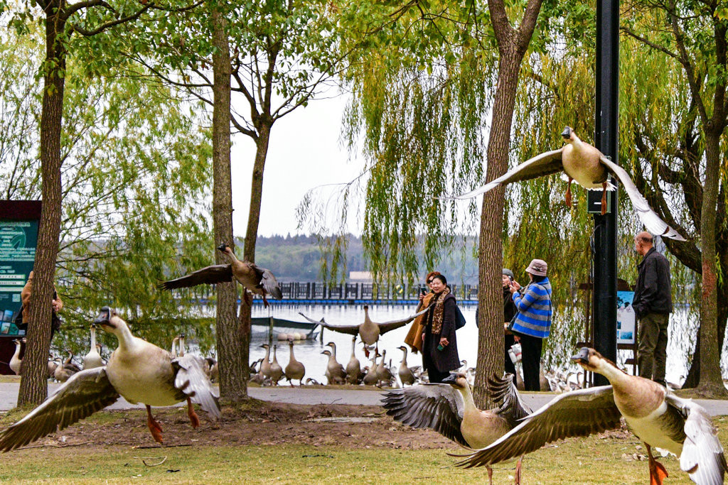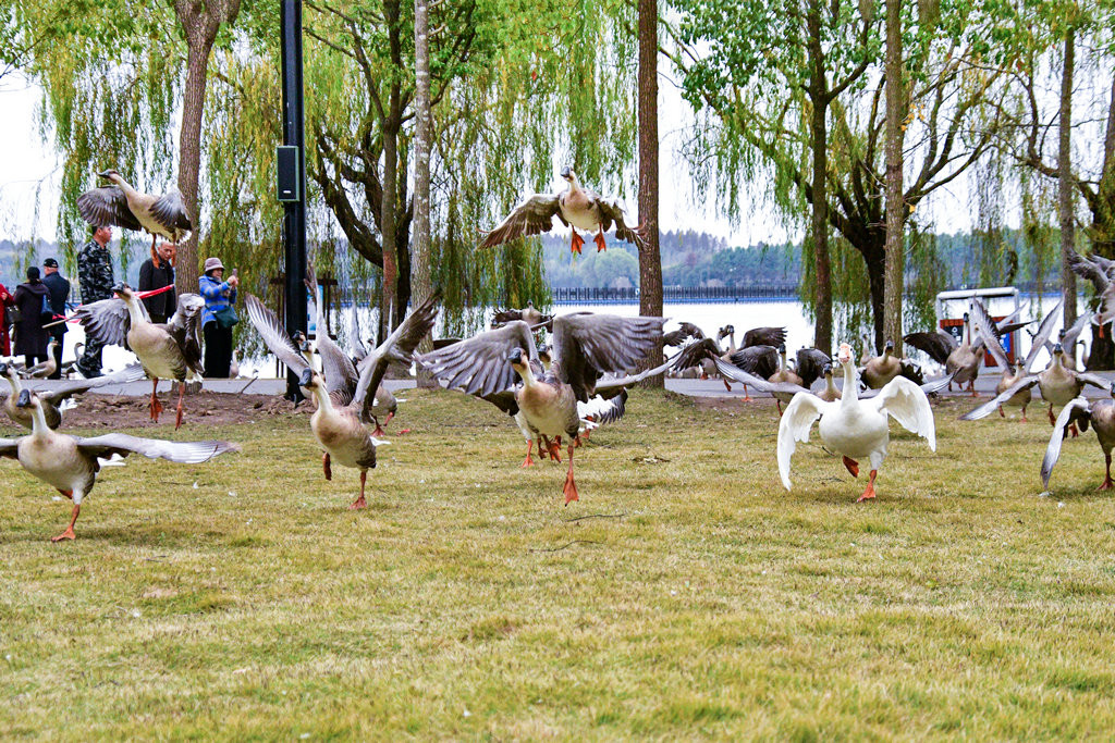 大草坪上,一群大雁围绕在喂食游客身边,甚为有趣。