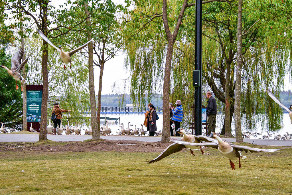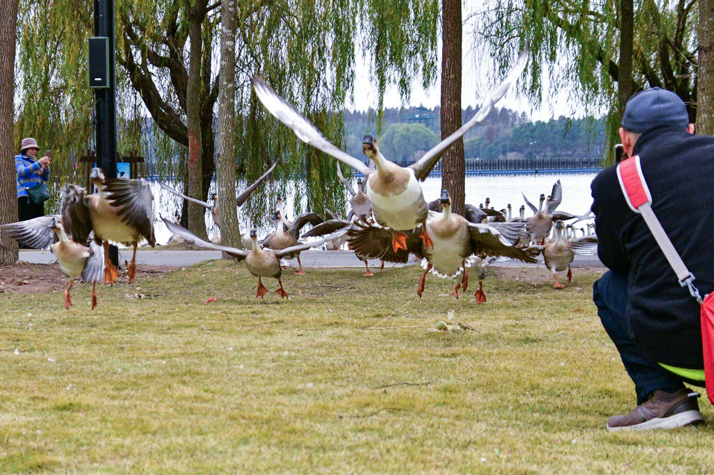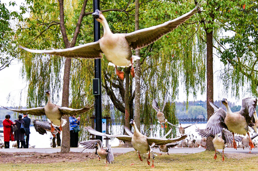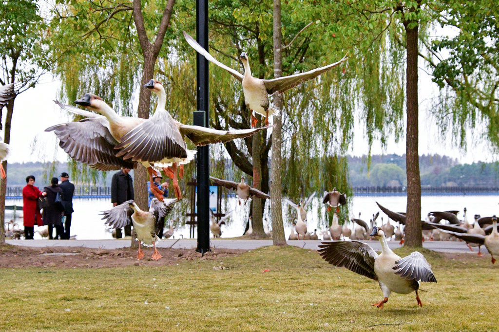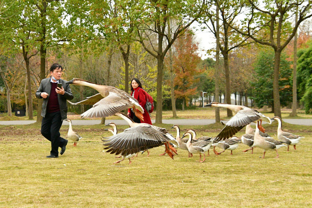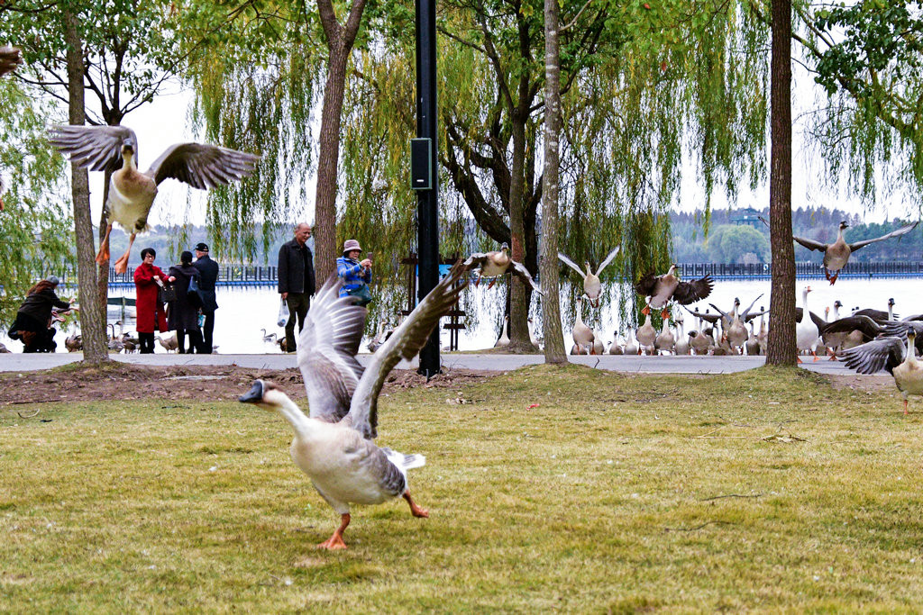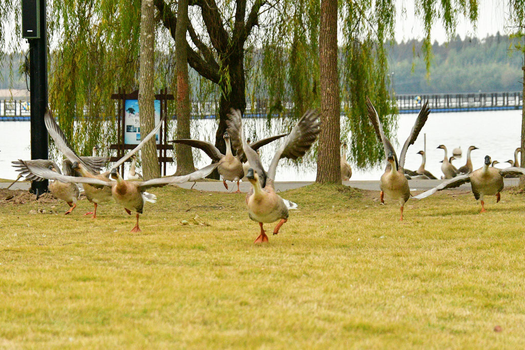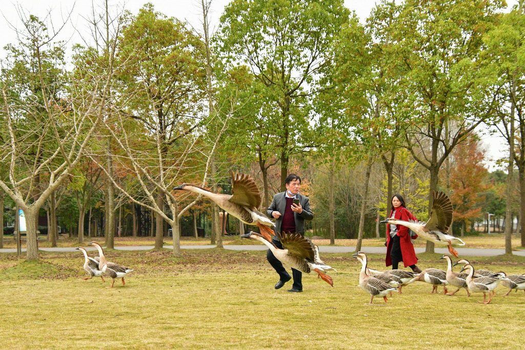 大草坪上,一群大雁围绕在喂食游客身边,甚为有趣。
