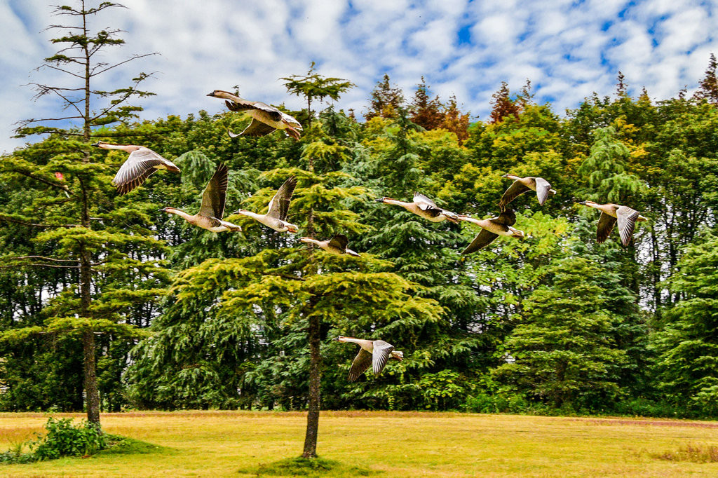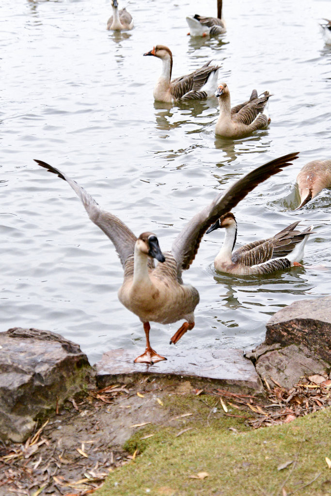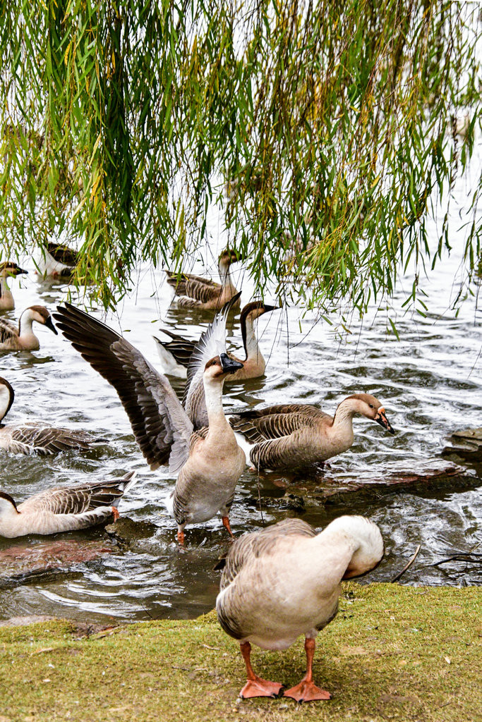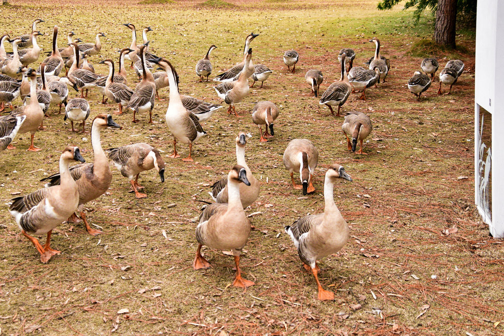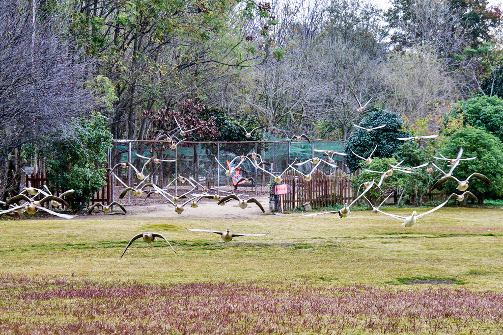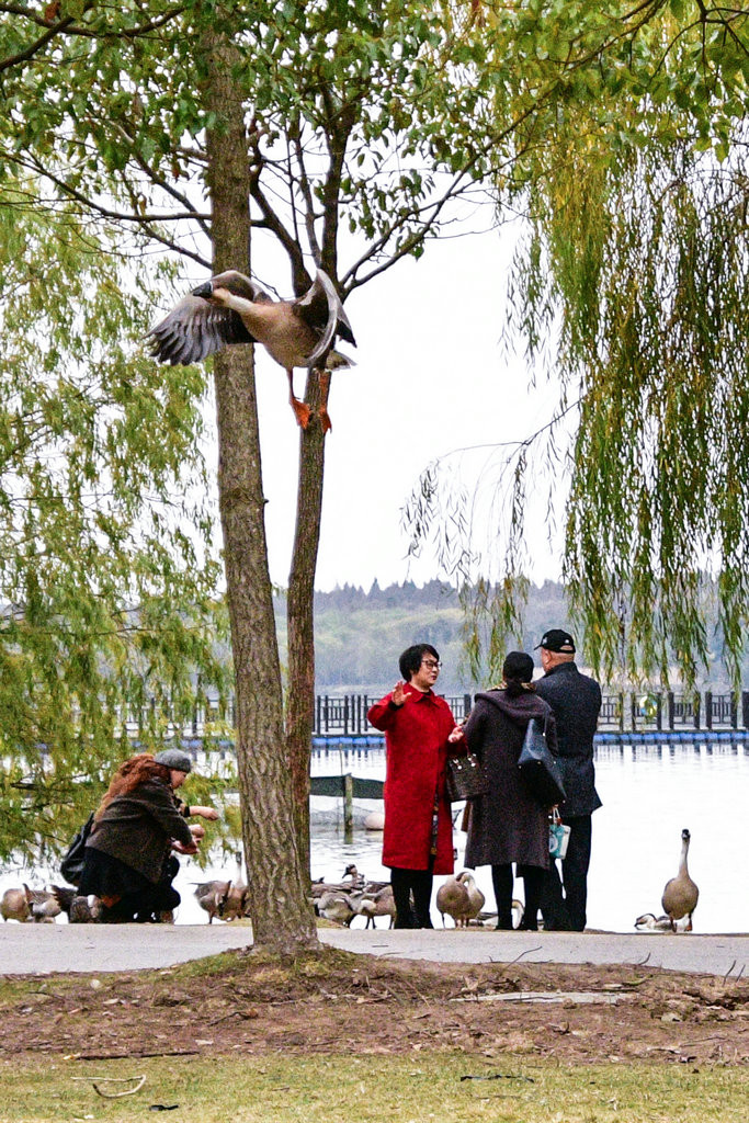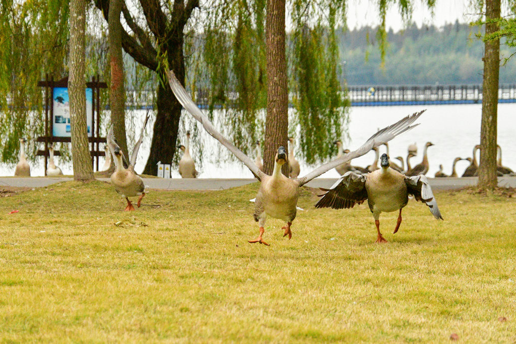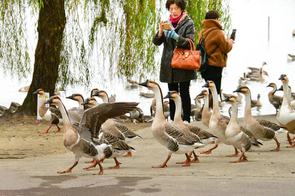大草坪上,一群大雁围绕在喂食游客身边,甚为有趣。