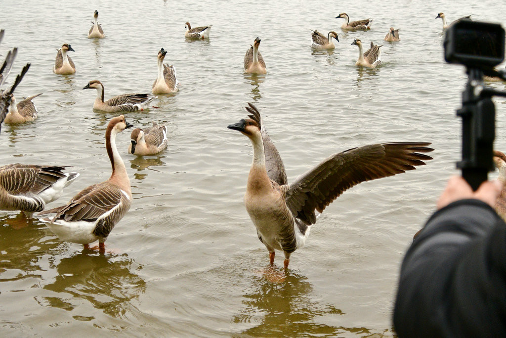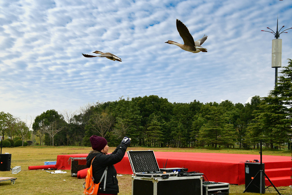 游客都拿起相机,摄录壮观的放飞表演,大雁放飞很震撼