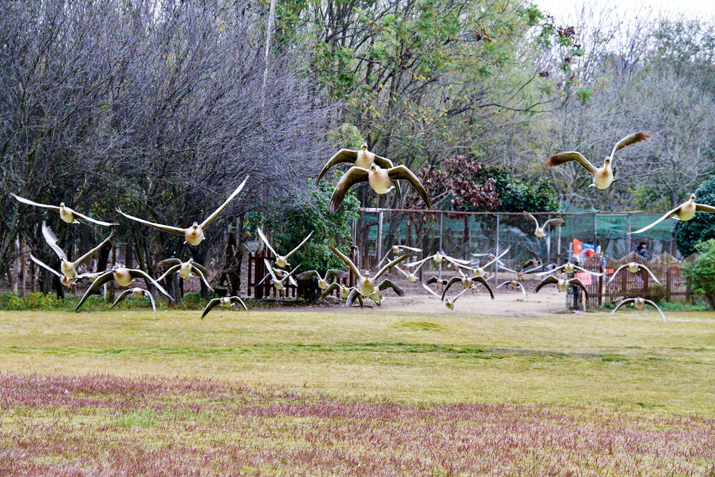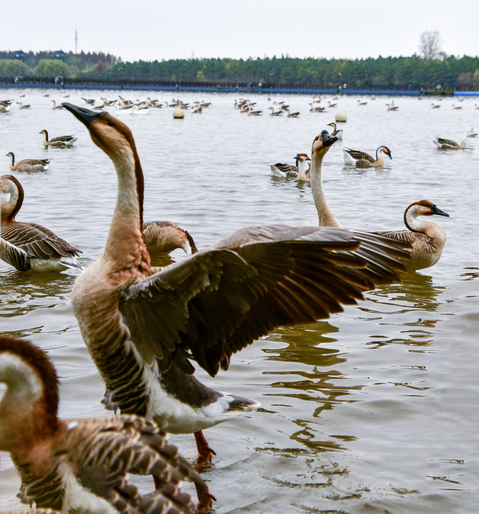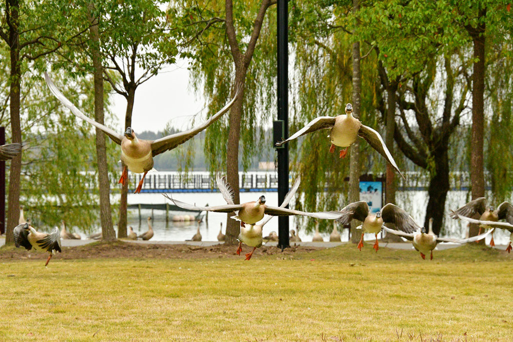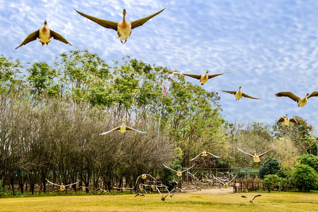 这些大雁目前适应了明珠湖的环境,进过驯化,飞翔表演更完美,景象更壮观