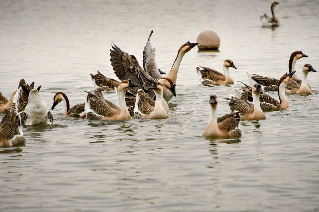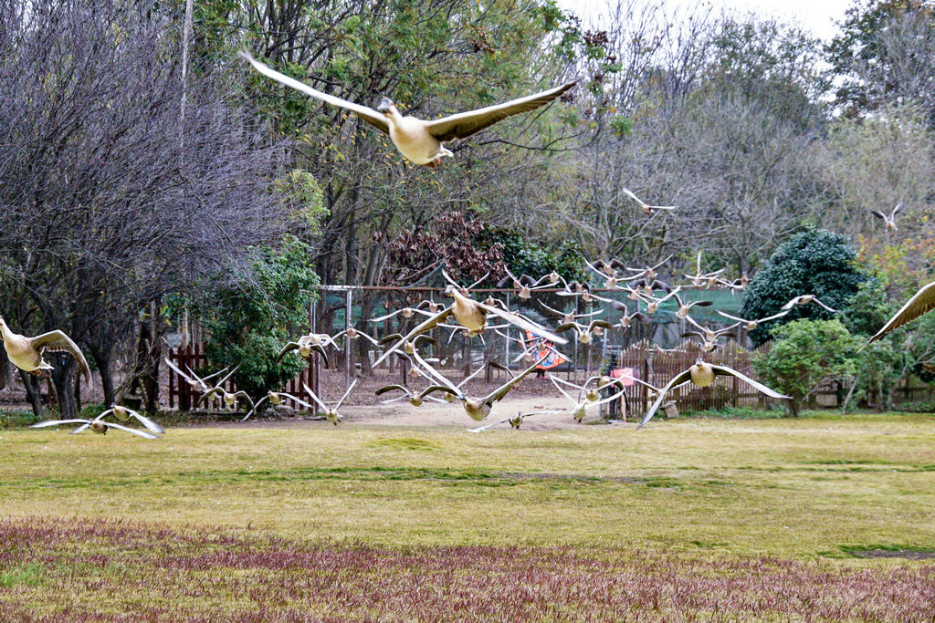 这些训练过大雁,只见笼舍大门一开,大雁一只一只陆续走出笼舍,训练师傅哨音一响,旗帜摇动,大雁陆续起飞,差不多的轨迹,分批飞向明珠湖