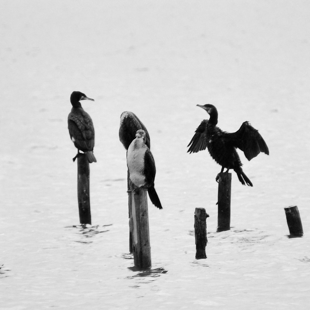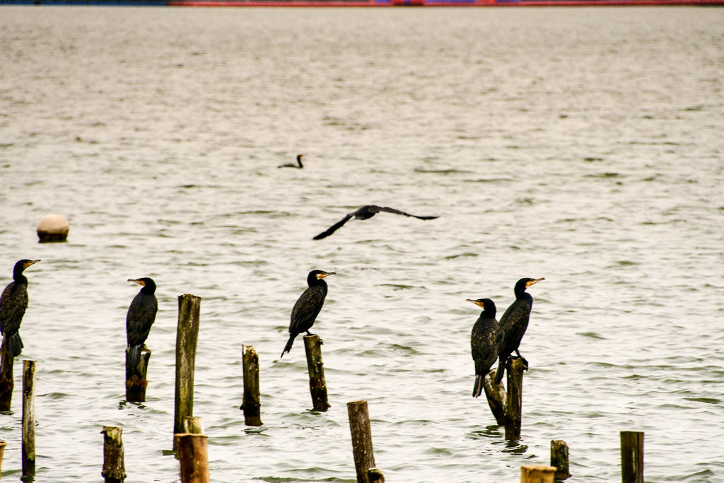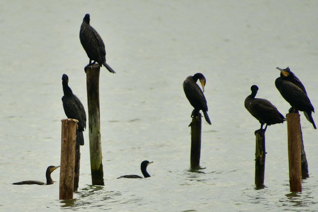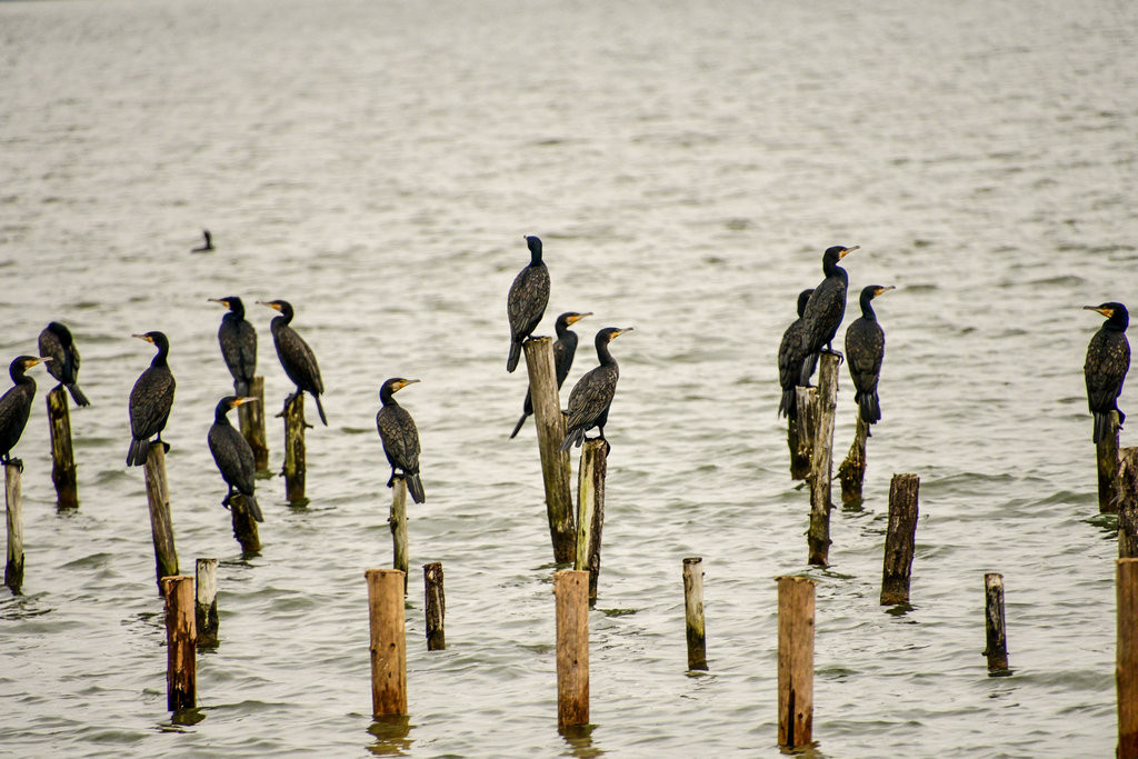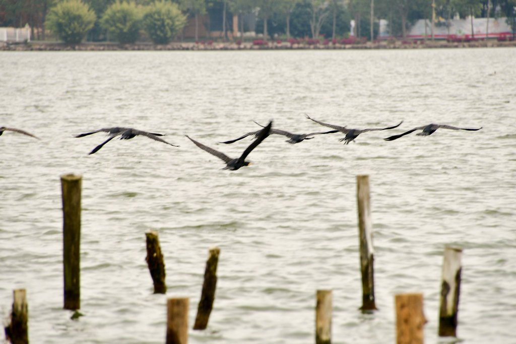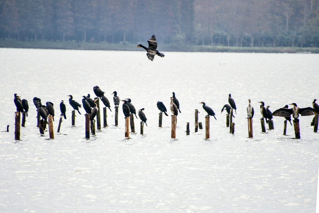 现在,正是观赏鸬鹚的好时机,来明珠湖公园就能看到他们的身影,它们就像站岗的“哨兵”,列队站在湖滨的一根根木桩上,成为明珠湖公园一道独有的风景线。