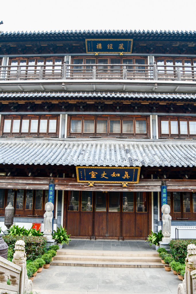 真如佛塔后的真如丈室及藏经阁藏经楼为三层木构重檐藏经阁,每层面宽五间,一层为真如丈室,由本色木料装饰,室内有整套红木法座、太师椅和茶几等家具,简朴庄重和古色古香。二、三楼是收藏各类经书的地方,收藏的佛教经籍有一万二千余卷,其中有十多种版本的大藏经,一千余幅名人字画,是讲经、弘法、著书、立说的清静吉祥之地。