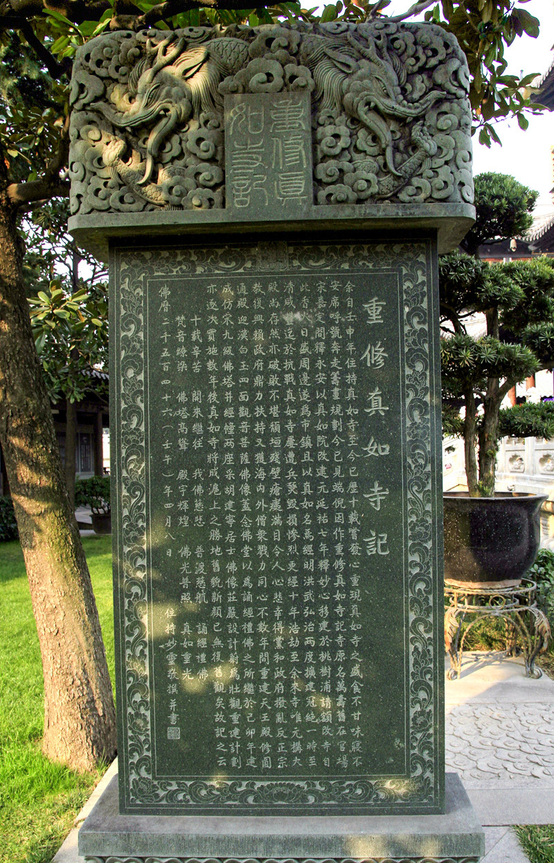 在真如寺主体建筑之西,沿桃浦河东岸建有一总长200米的木构书画长碑廊,在长廊北段错落有致地镶嵌着形态各异的宝塔式、插屏式、鼓式、经幢式、屏风式等多元化、富含佛教韵的石碑。