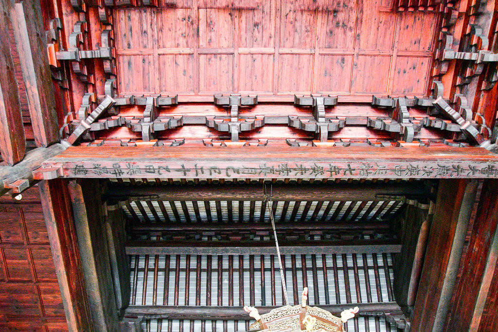 真如寺正殿明间内额下的“旹大元岁次庚申延佑七年癸未季夏月乙巳二十乙日巽时鼎建”的大樑,据说是寺庙建成时刻下的题记,这条双钩阴刻题记与文献记载相吻合,从而证实了普陀区这座其貌不扬的小殿是上海现存最早的木构建筑,同时也是江南弥足珍贵的早期遗构。
