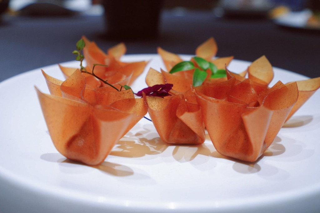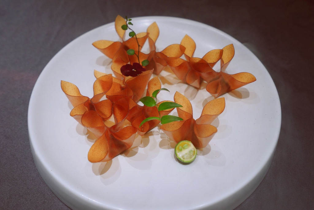 ↑↓#果丹皮鹅肝酱#薄薄的果丹皮制成花瓣,包裹着细腻滑润的鹅肝酱,酸甜中还伴着一点淡淡的鹅香,无腥味。