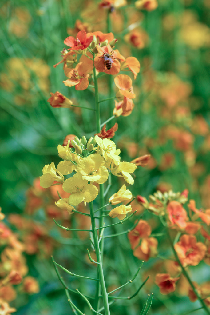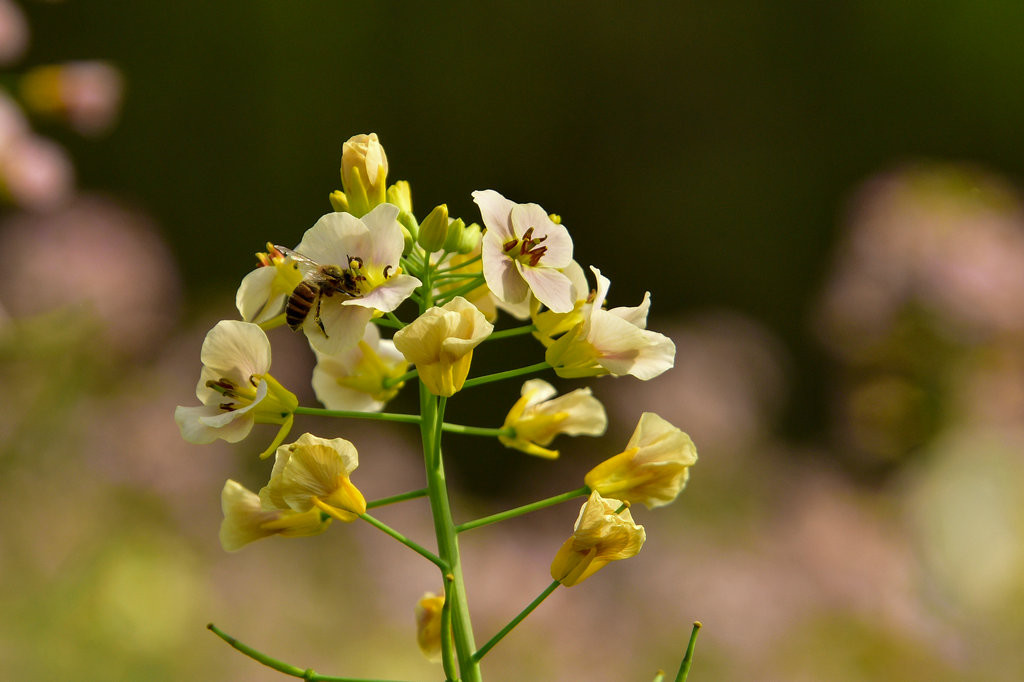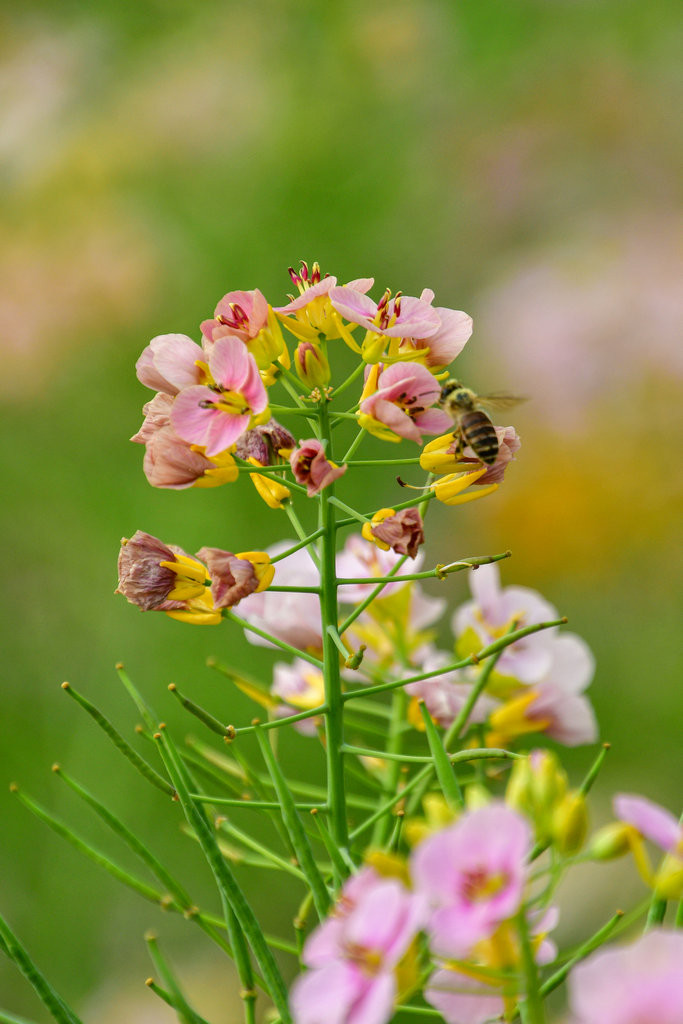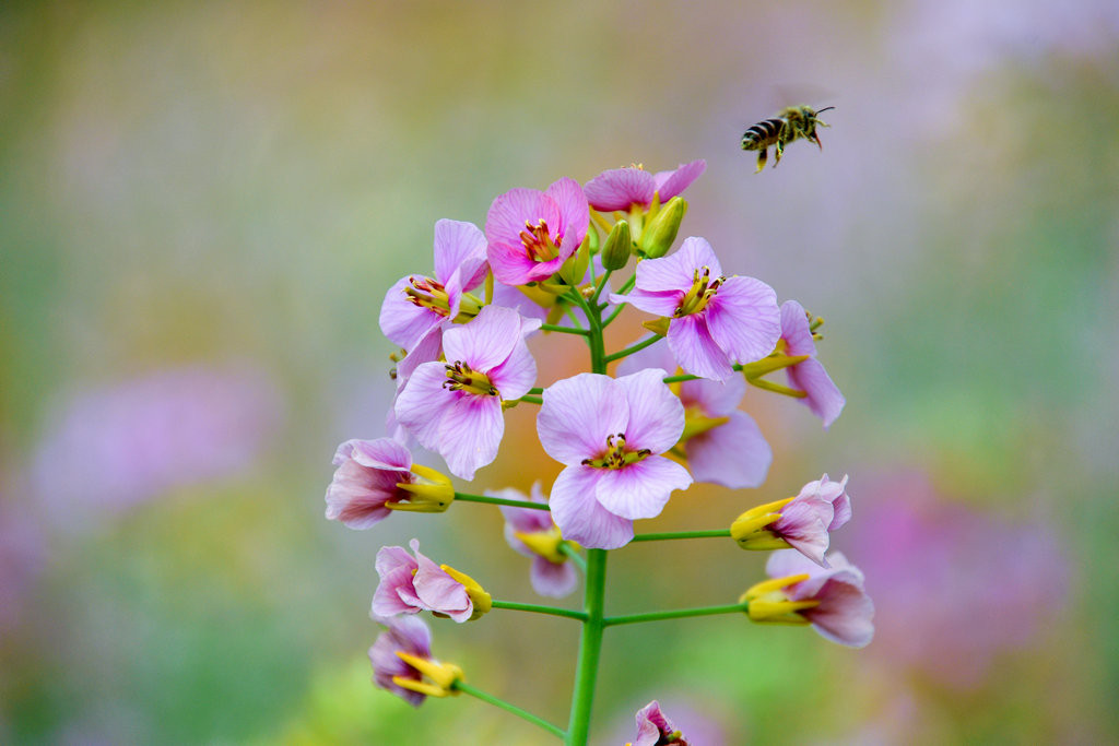 彩色的油菜花田渲染了春天,正在五彩油菜花上采蜜的蜜蜂