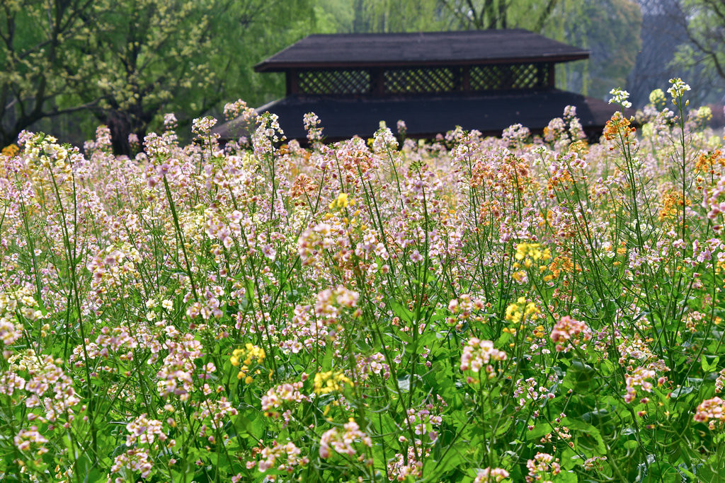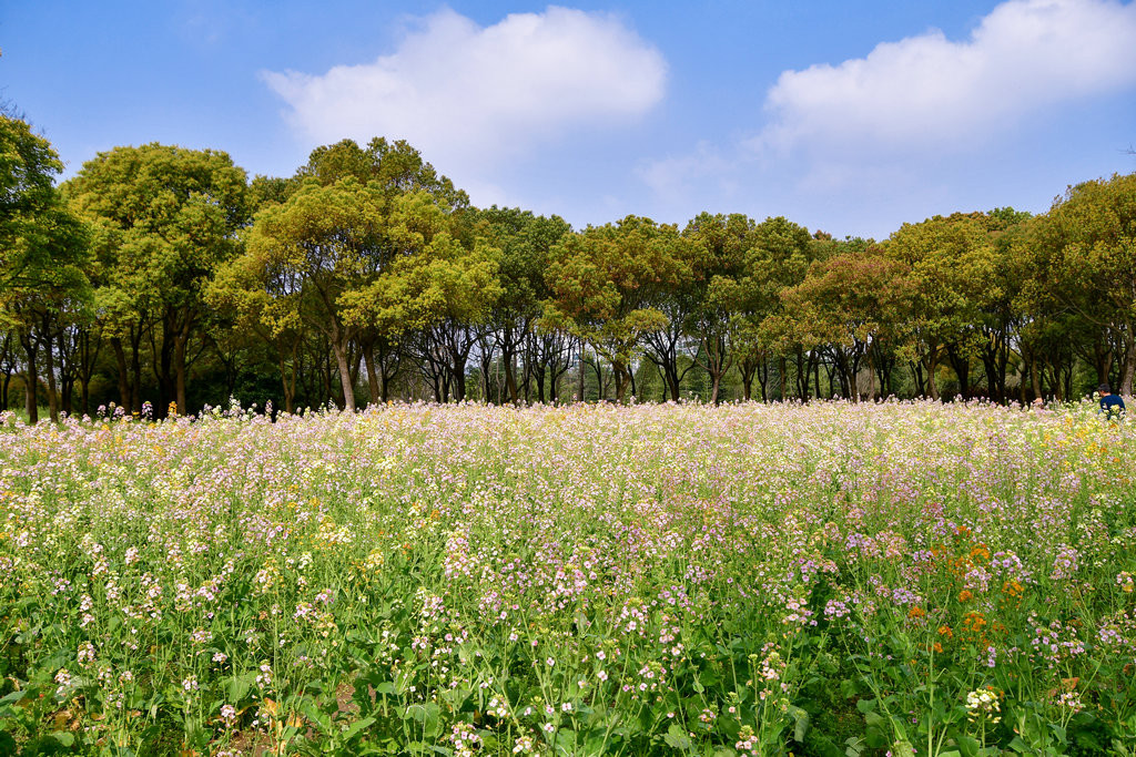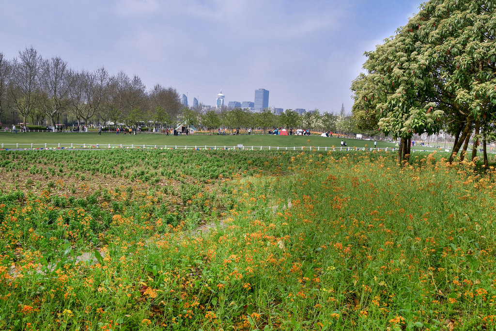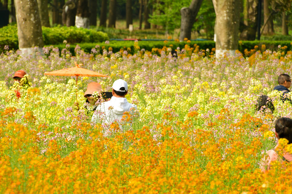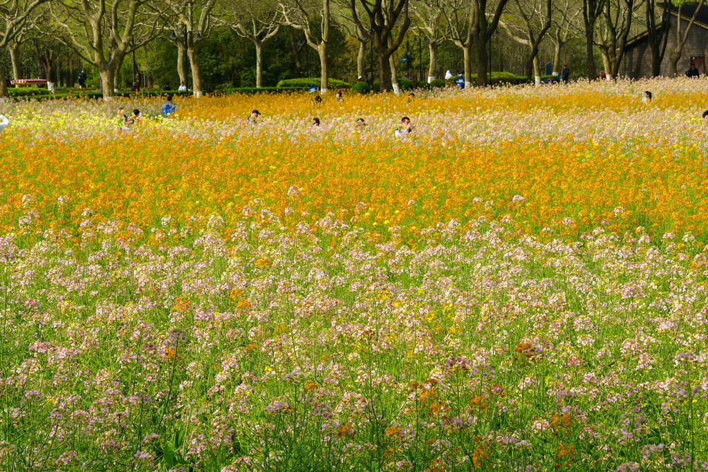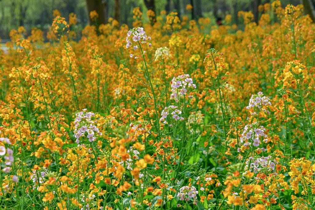 油菜花,这种并不属于珍稀品种的花,价值却平实有用,一般的油菜花,以明黄色为主,而在世纪公园的花海中,油菜花有深紫色、粉色、白色、橘红色、粉紫色等多个色系在嫩绿的油菜叶衬托下,争奇斗艳,仿佛春天的调色板打翻在田野里。