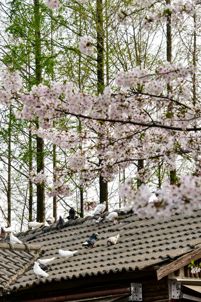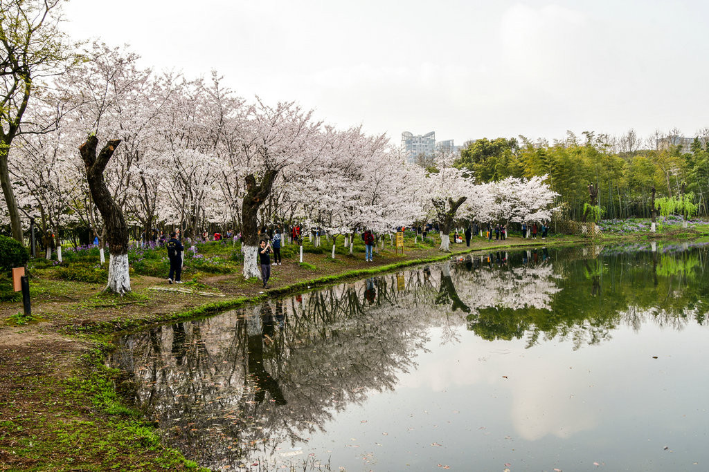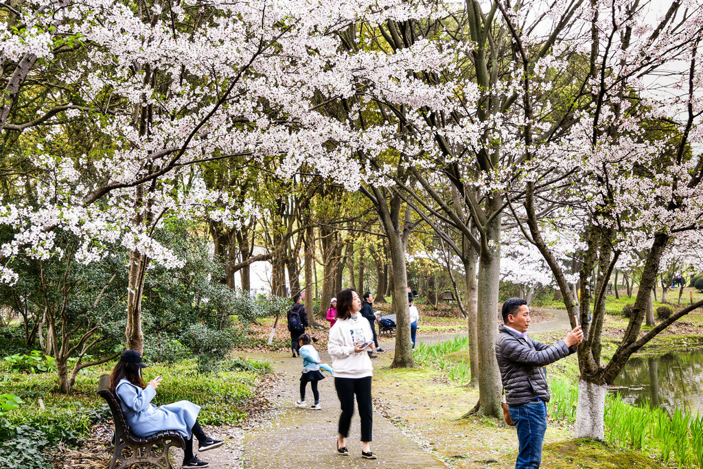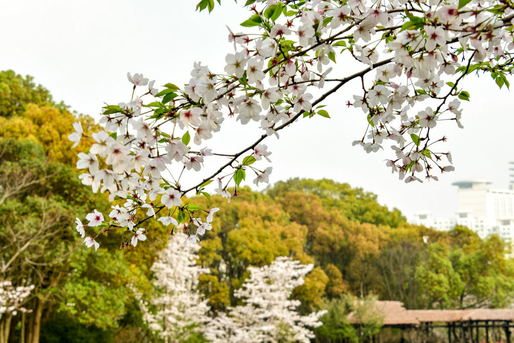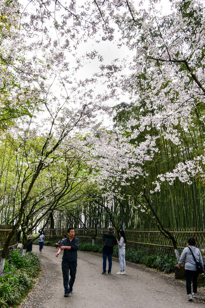 栽种樱花的弯曲小路一头连着鸽园,另一头通向竹林。花开时节,漫步小道,落英缤纷,水影婆娑,湖边嫩绿的柳丝随风飘荡,衬托着盛开的或白或粉的樱花更加剔透清雅。