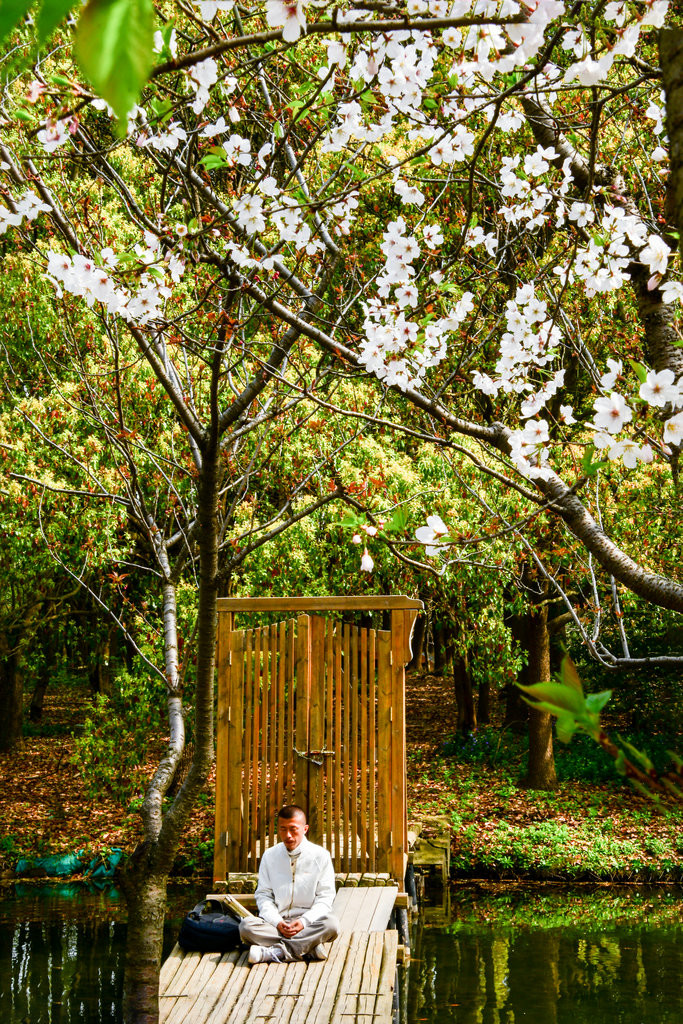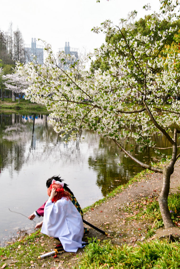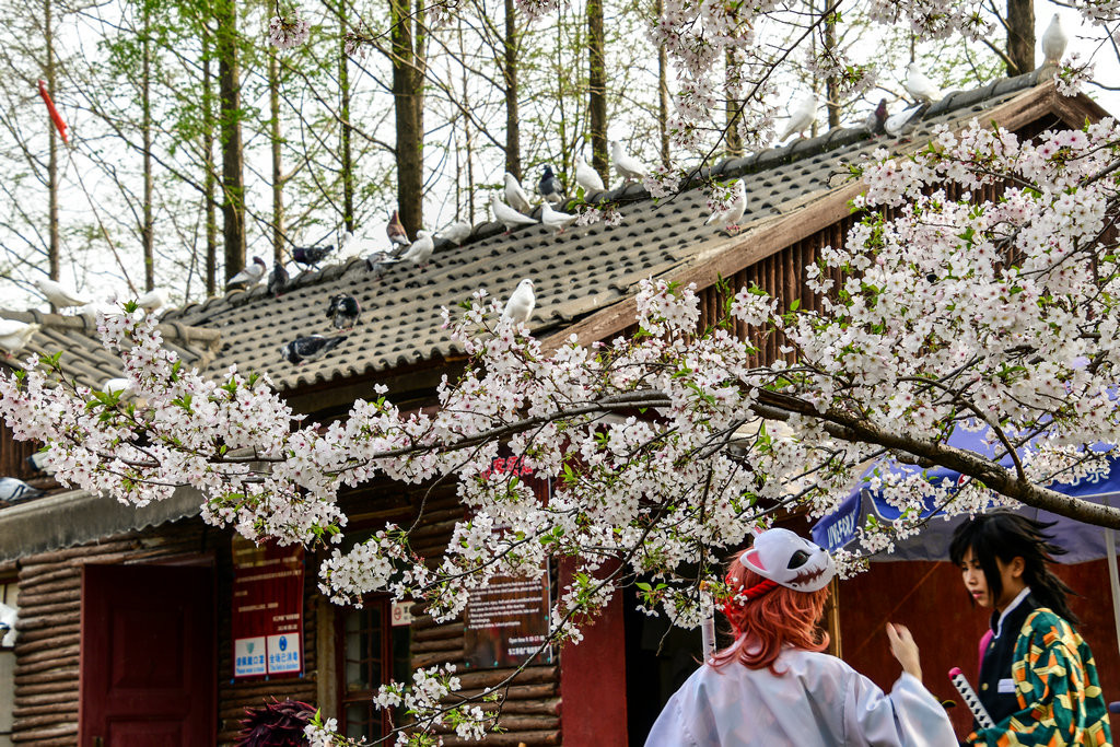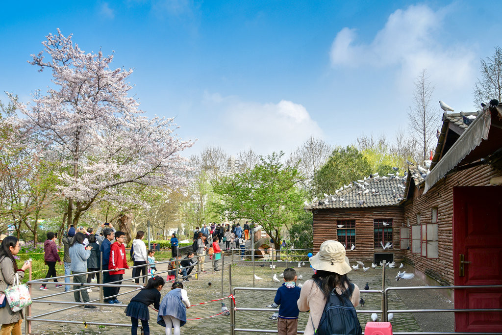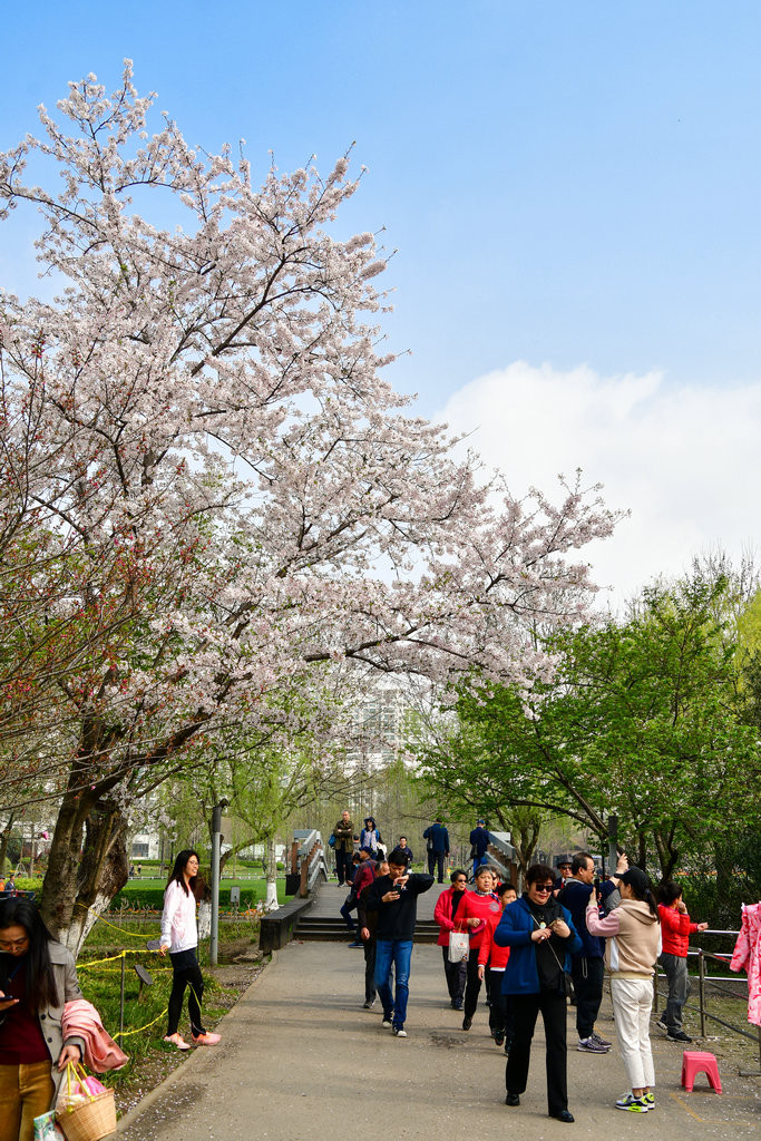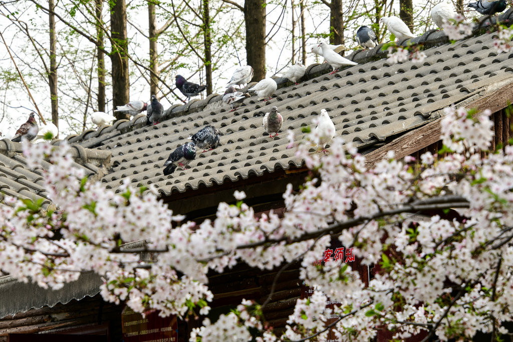 栽种樱花的弯曲小路一头连着鸽园,另一头通向竹林。花开时节,漫步小道,落英缤纷,水影婆娑,湖边嫩绿的柳丝随风飘荡,衬托着盛开的或白或粉的樱花更加剔透清雅。