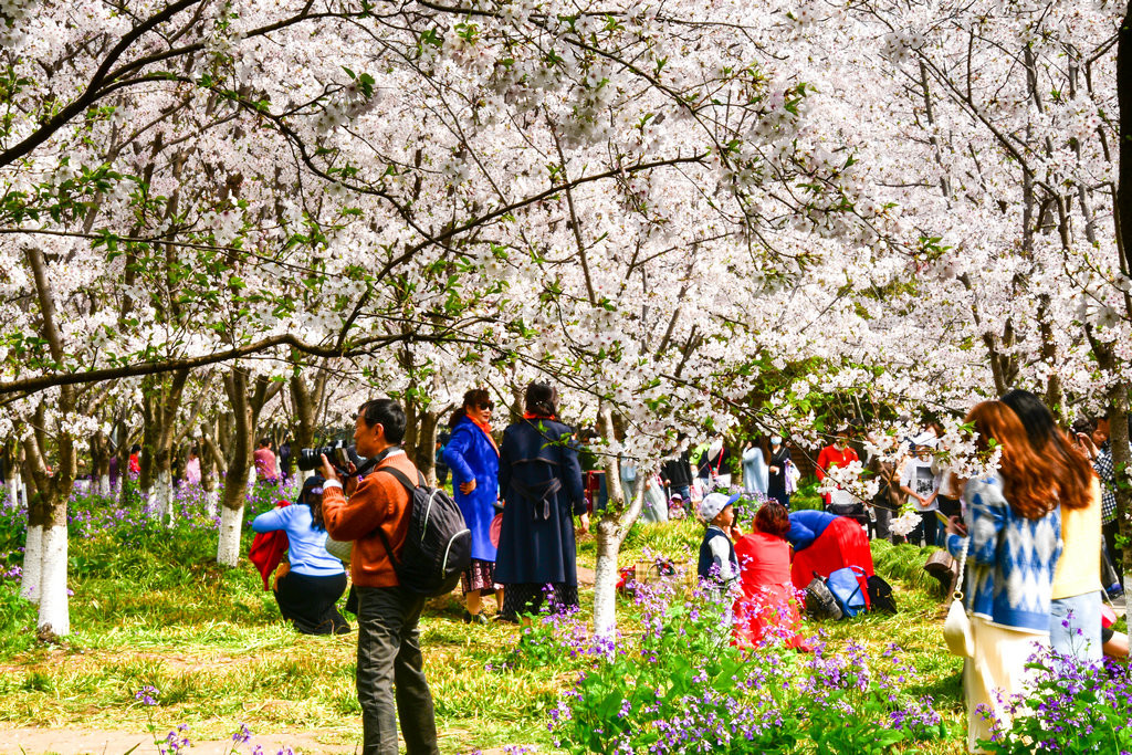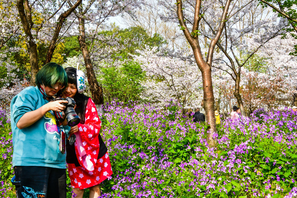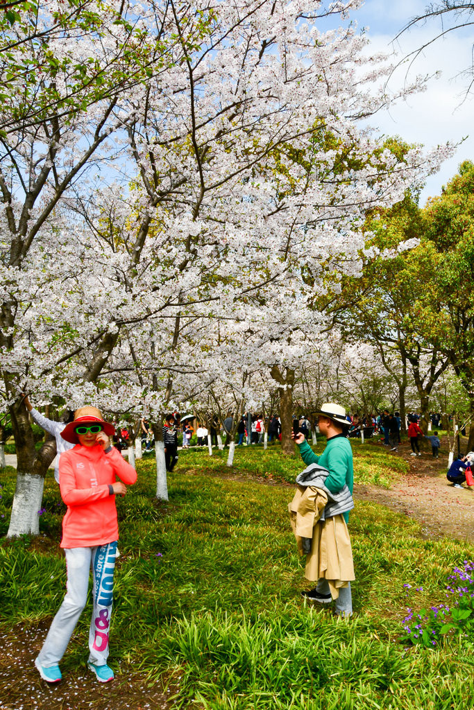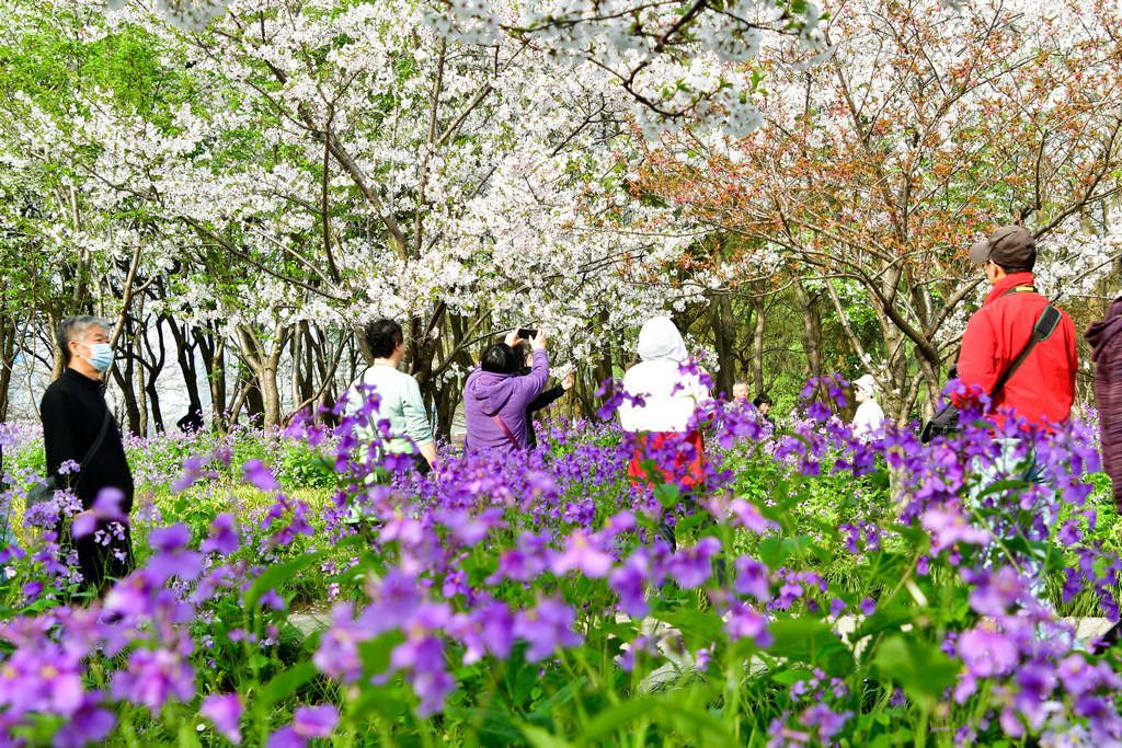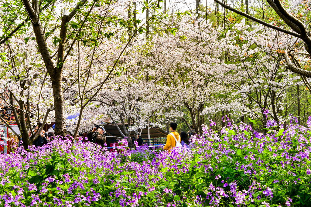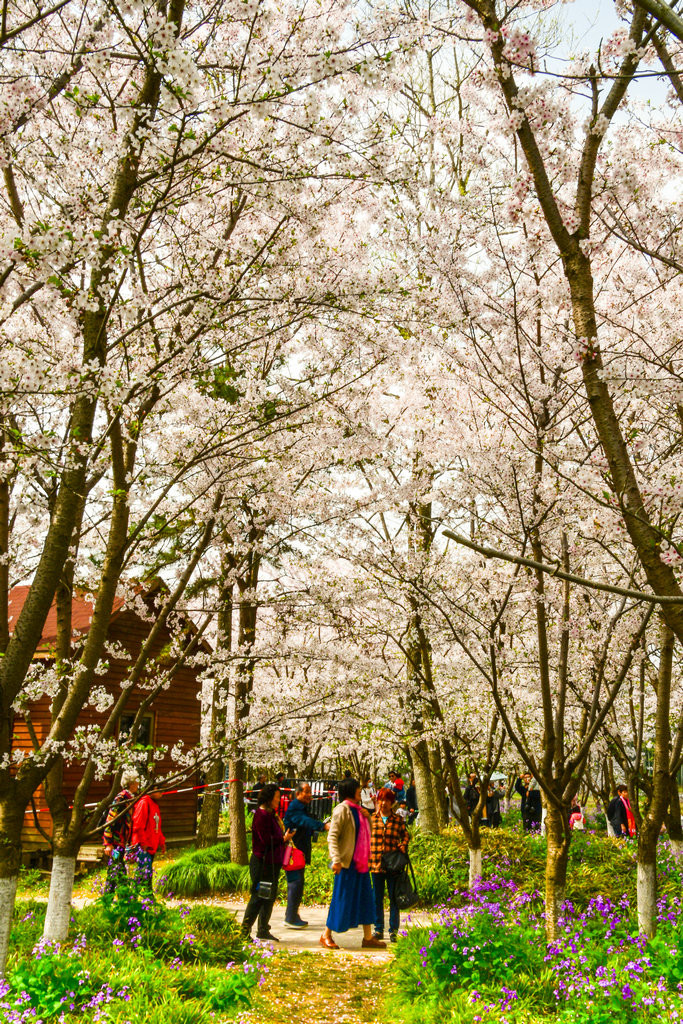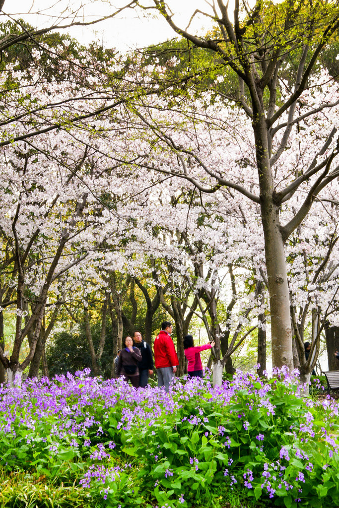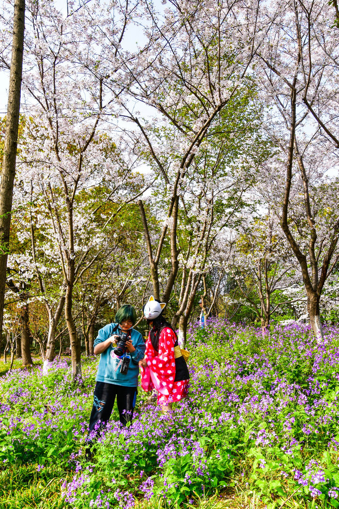 放眼望去,,上层樱花成云,下层二月兰遍地。