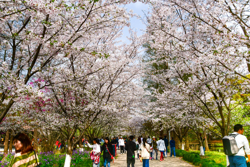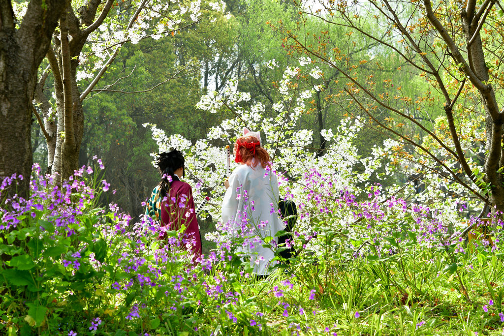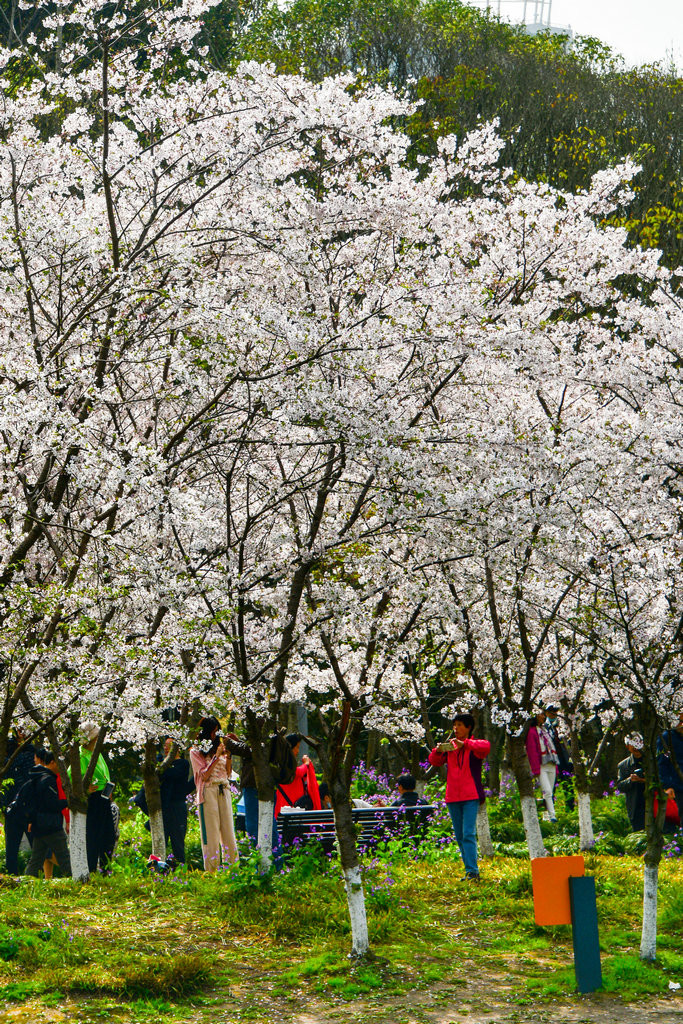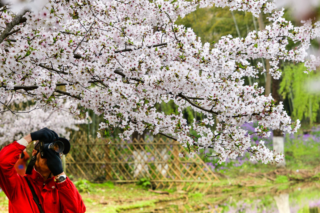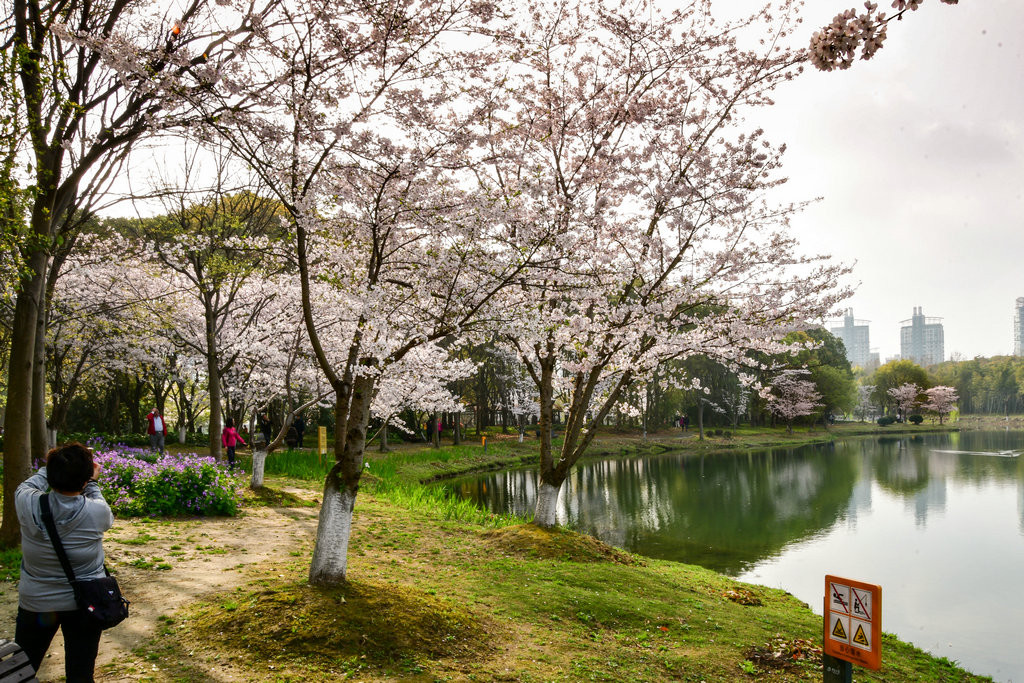 临湖凭栏远眺,白如雪的樱花在青翠柳树和紫色野花的衬托下,愈发娇羞可人。