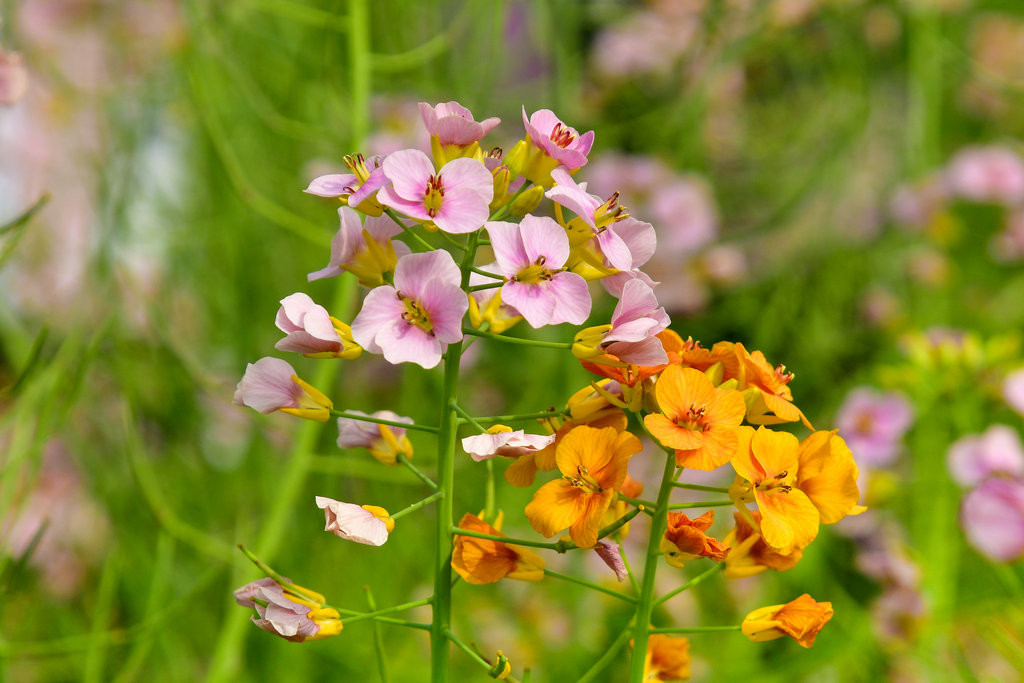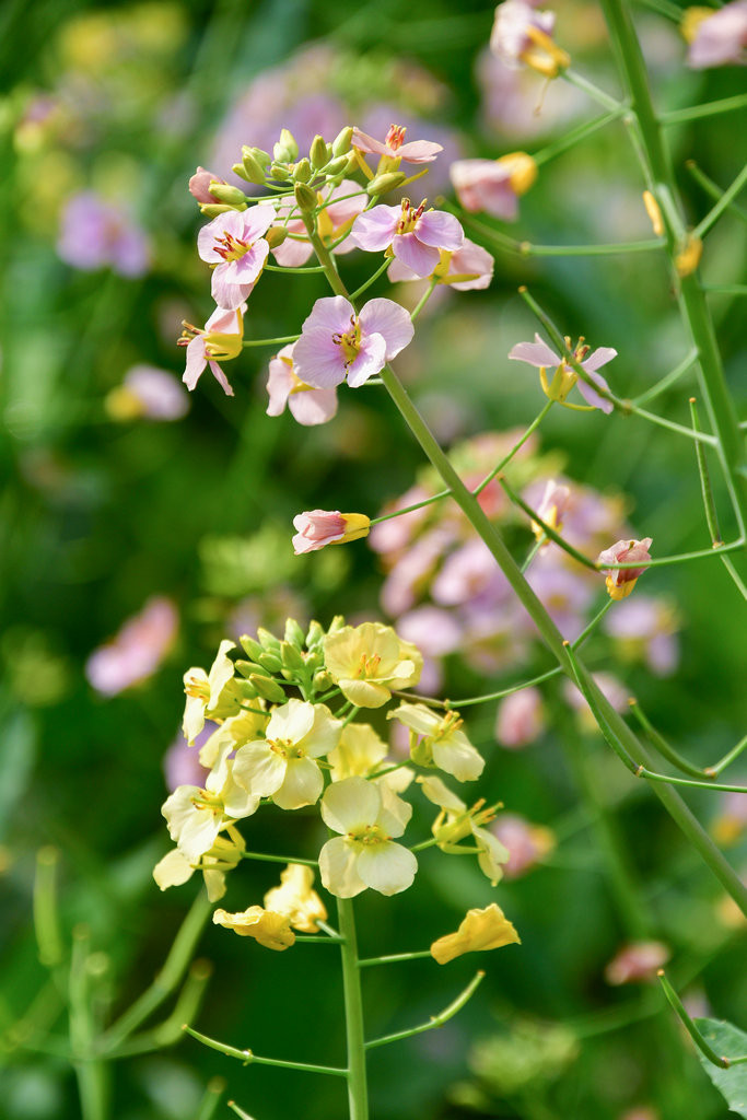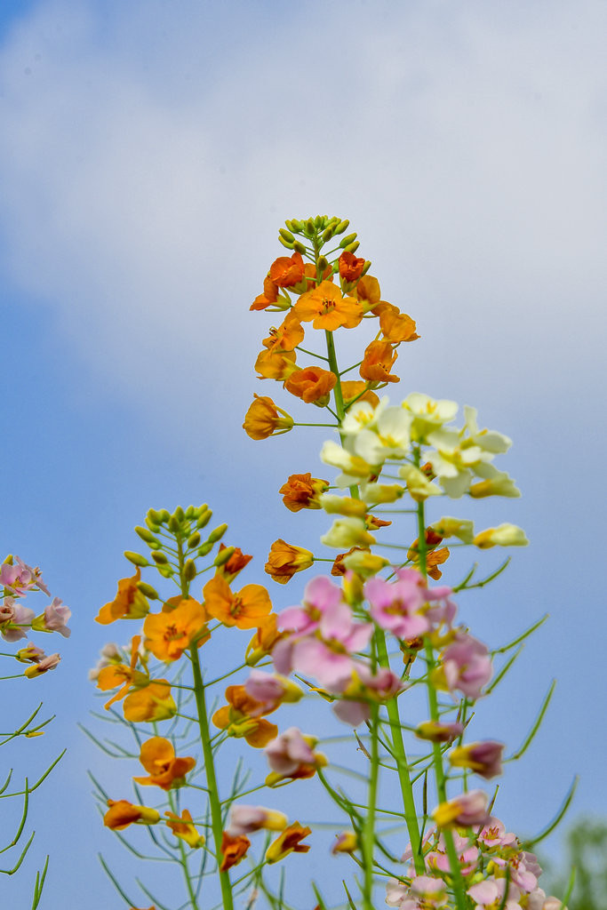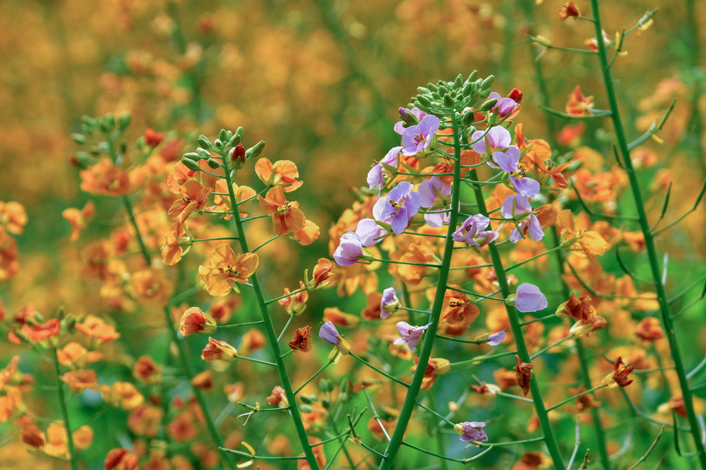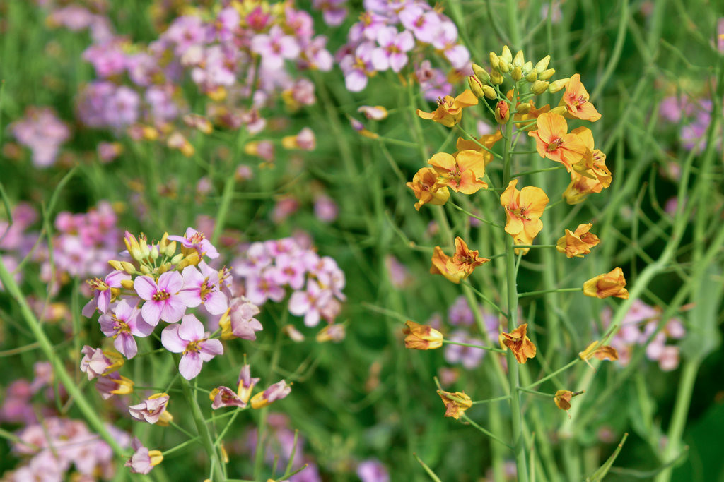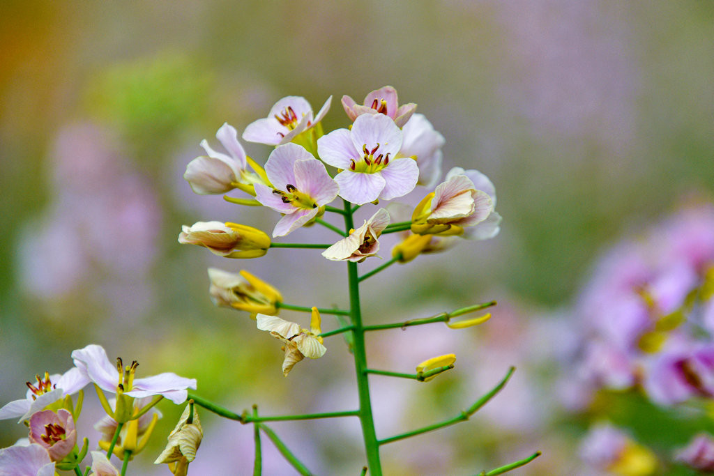 盛开的五彩油菜花。深紫色、粉色、白色、橘红色、粉紫色的油菜花在嫩绿的油菜叶衬托下,争奇斗艳,仿佛春天的调色板打翻在田野里