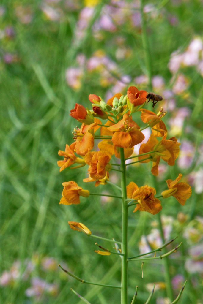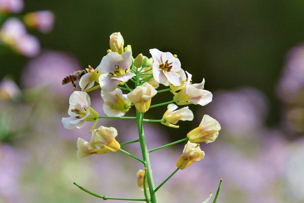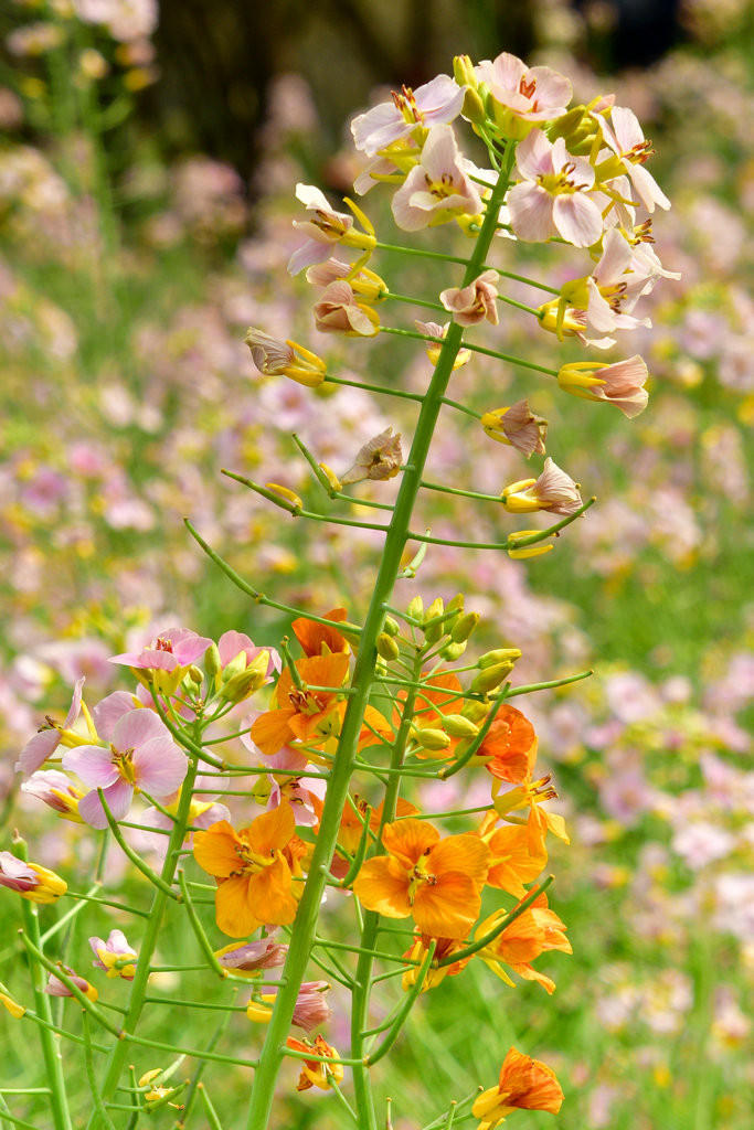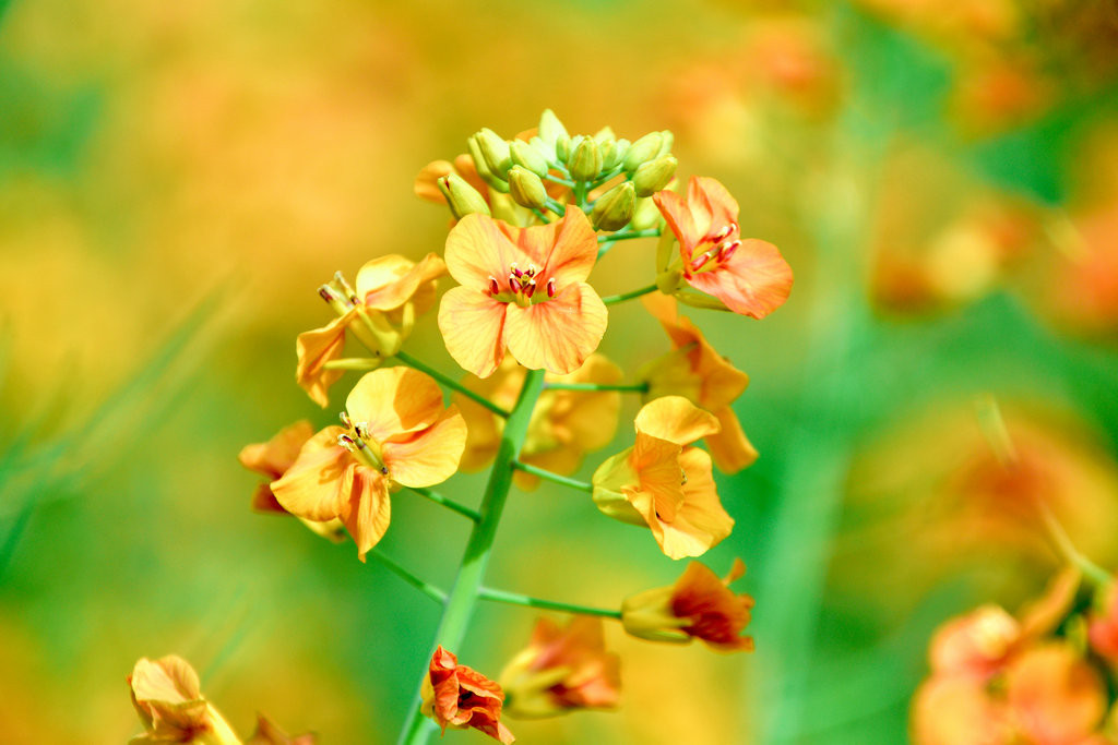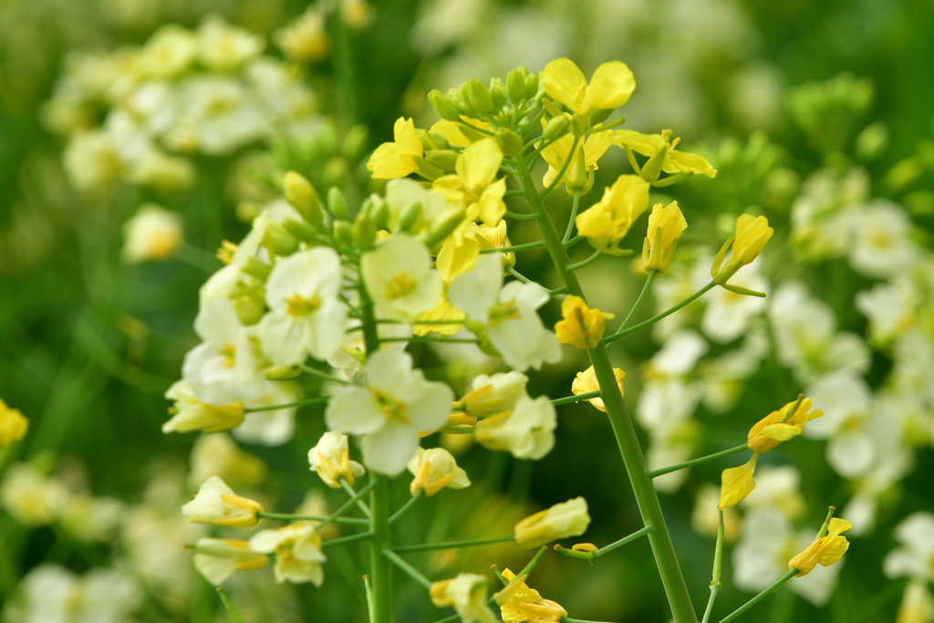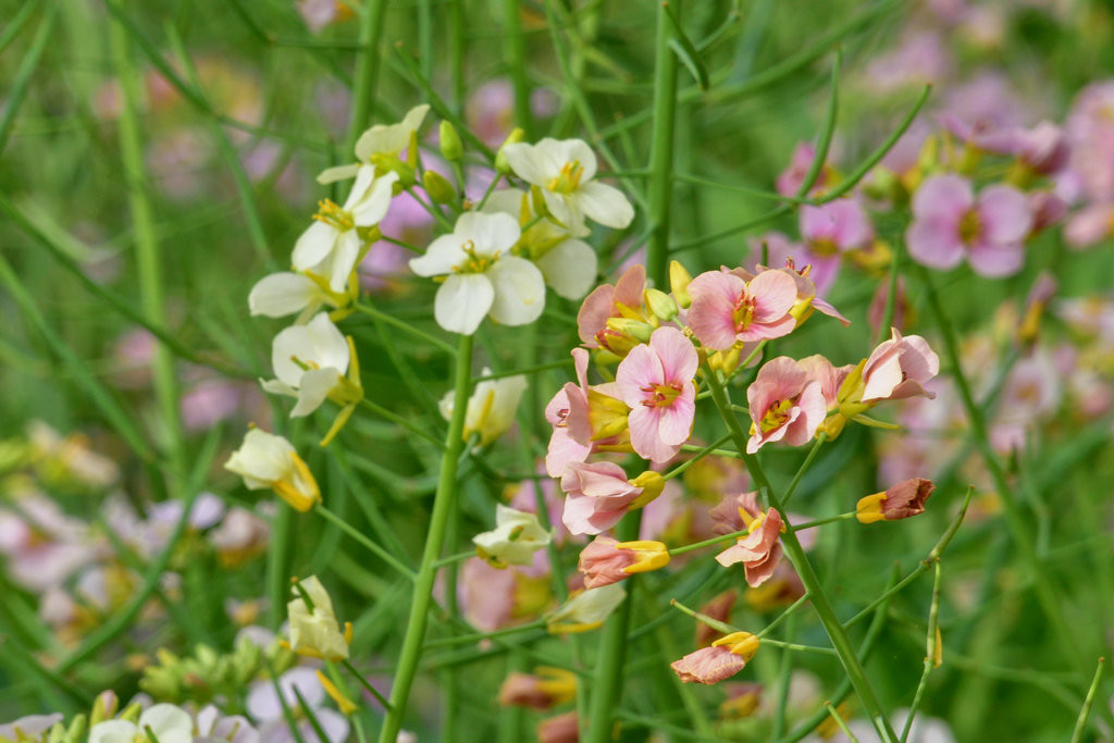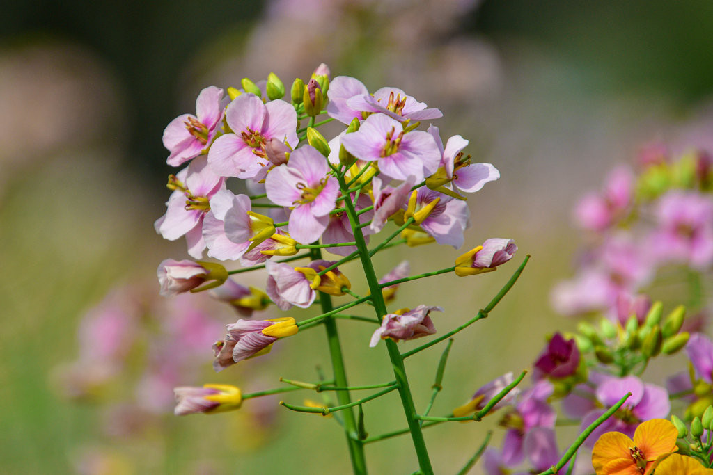 盛开的五彩油菜花。深紫色、粉色、白色、橘红色、粉紫色的油菜花在嫩绿的油菜叶衬托下,争奇斗艳,仿佛春天的调色板打翻在田野里
