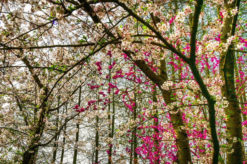 遍地的蓝色二月兰与成排樱花互相呼应,温柔恬雅