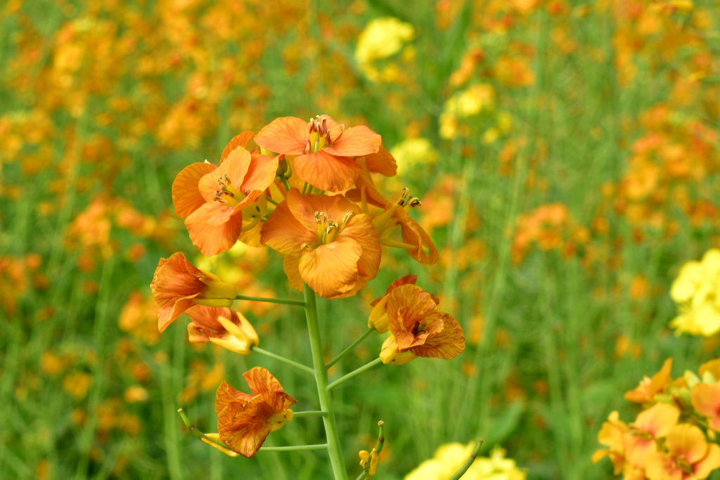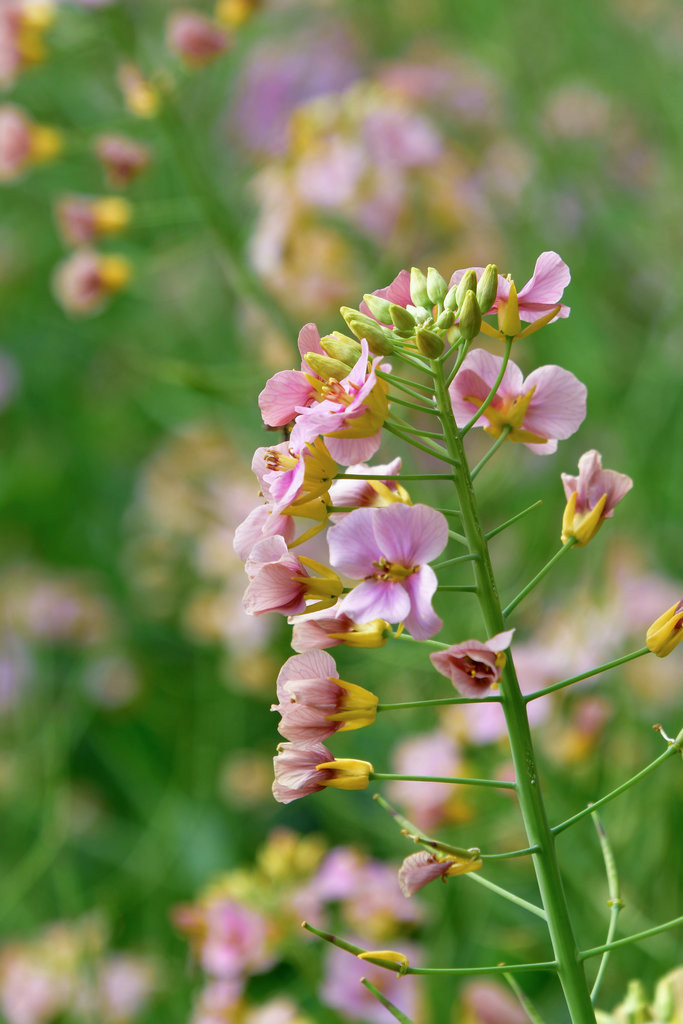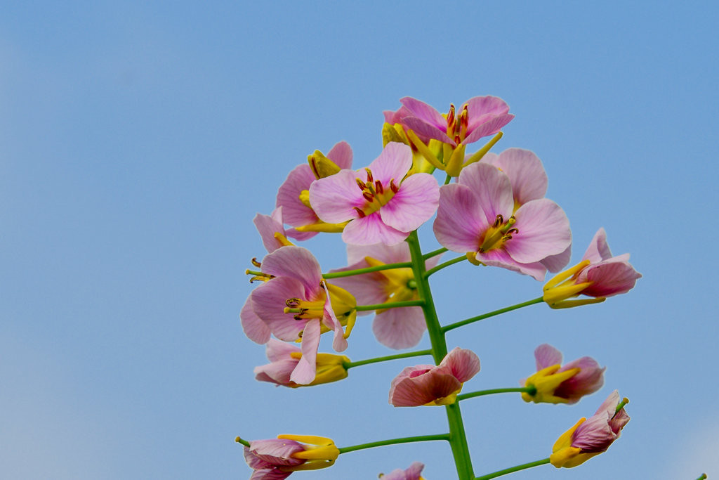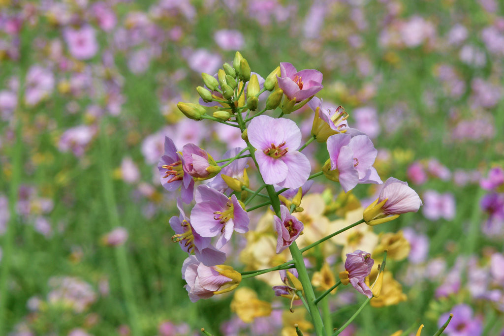 当初,农科所专家发现萝卜的花有各种颜色,于是通过生物技术将萝卜的彩色花色基因转育到油菜上,按照花色从浅到深的发展,用8到9年的时间让油菜花后代连续自交,令花色稳定下来,逐渐形成了现在白色、粉色、橘红色、粉紫色、深紫色等色系的油菜花新品种。