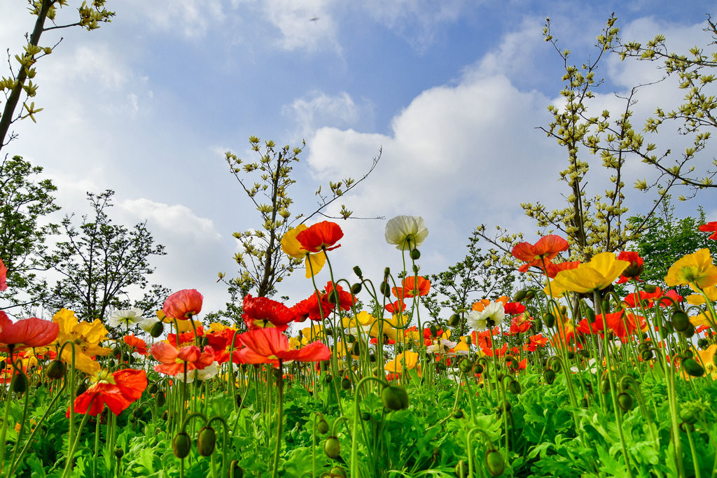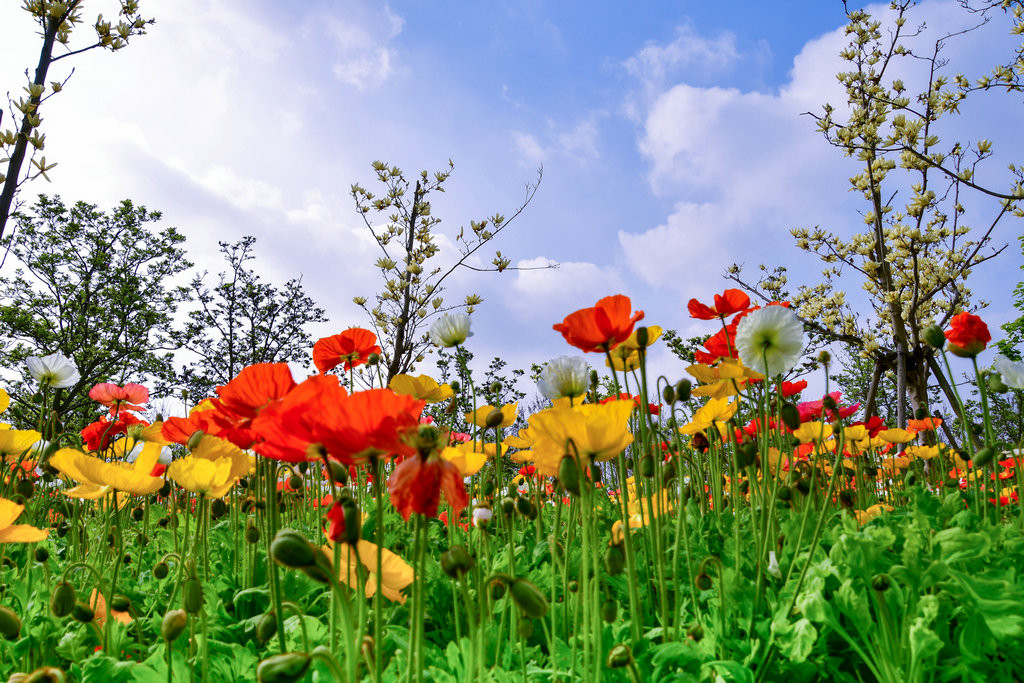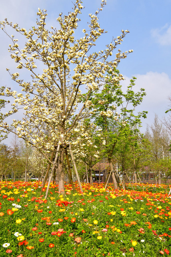 绽放的黄玉兰树下,起伏的虞美人花田意境十足,梦幻而又浪漫