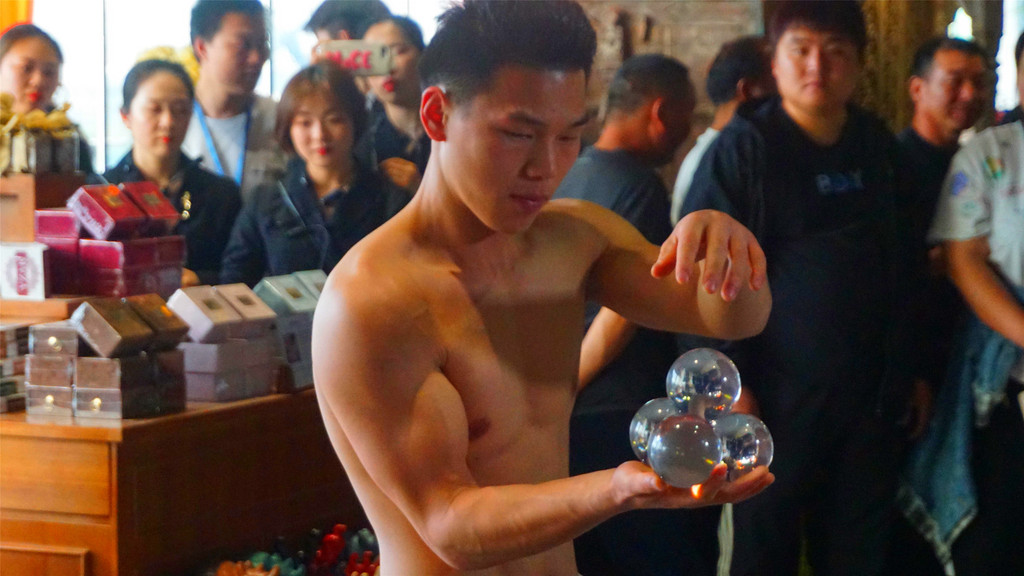 户外太热的话,可以到室内坐坐,天上街市里,男演员和水晶球融为一体。