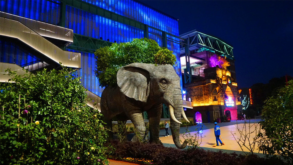出门的时候,已是夜幕降临,上海宋城在蓝色的光影下,煞是好看!还看到了一头巨大的象鼻子。