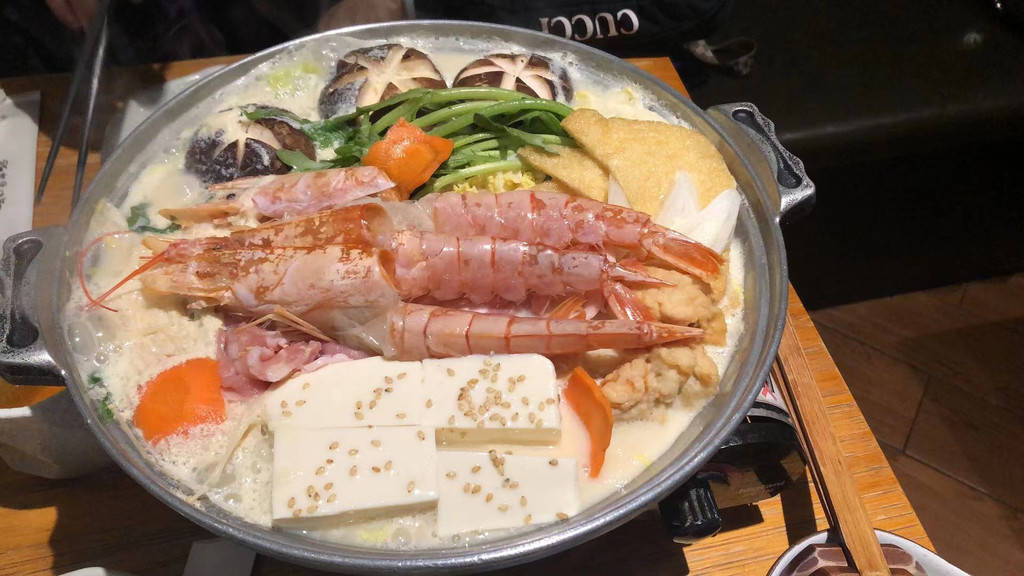 豆乳火锅锅底是鲜豆浆,又有白菜和大虾增鲜,母上大人表示以后可以尝试下做豆浆火锅,哈哈。