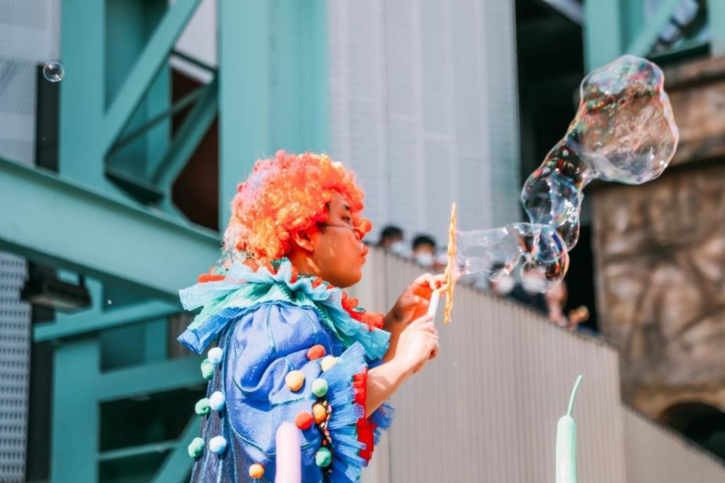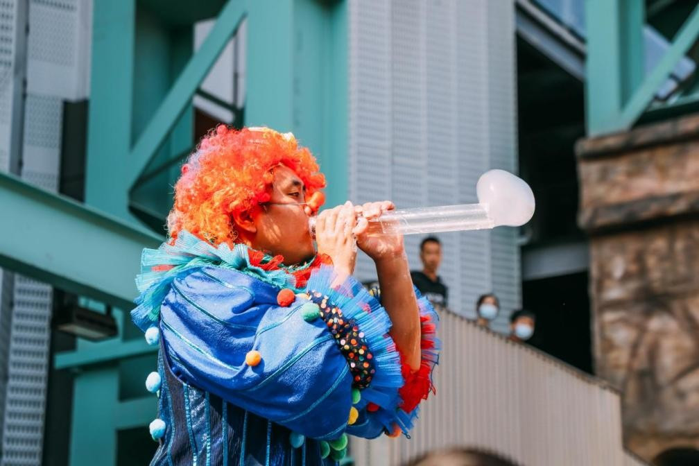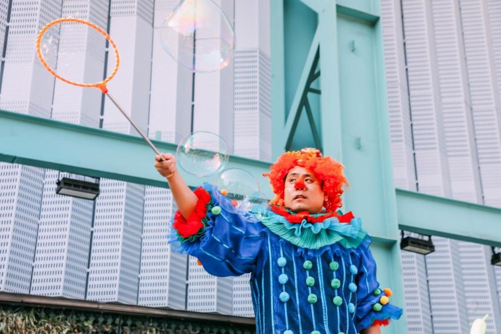 再往里走,音乐广场上人头攒动,可爱的小丑艺人很会挑动气氛,小朋友们都坐在父亲的肩膀上凑着热闹,原来是园区安排的“魔幻泡泡”,小丑艺人瞬间变身泡泡秀大师,现场表演徒手吹泡泡、绳子泡泡、泡泡圈、烟雾泡泡等,不时掌声雷动现场热情高涨。