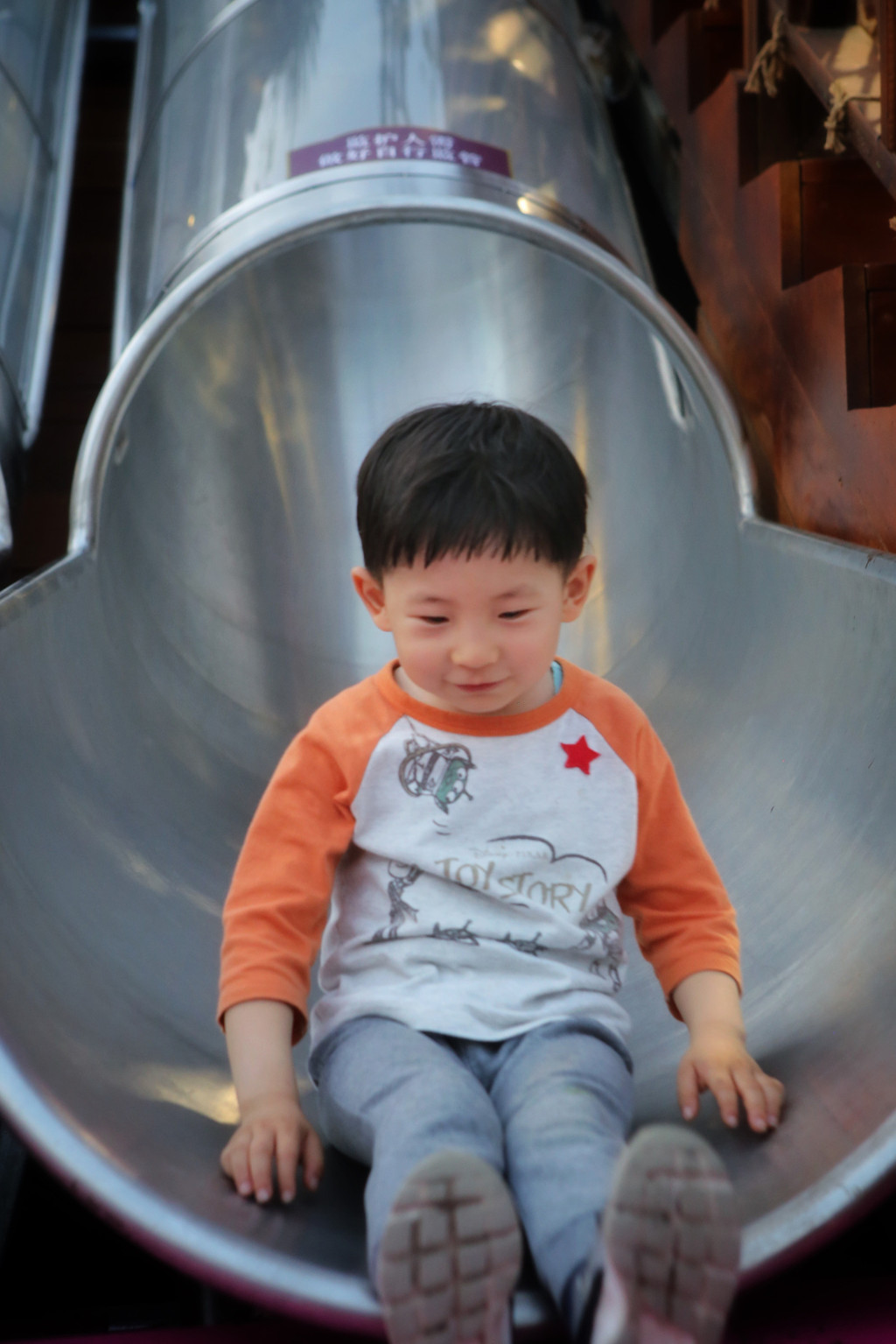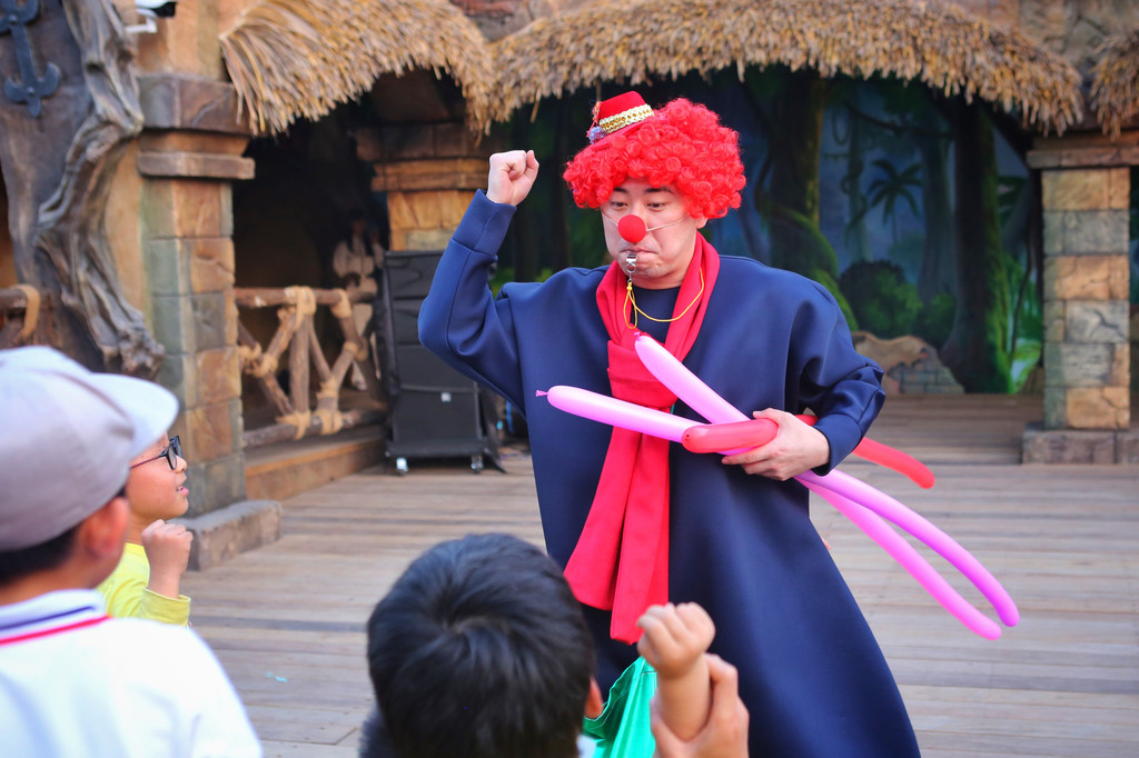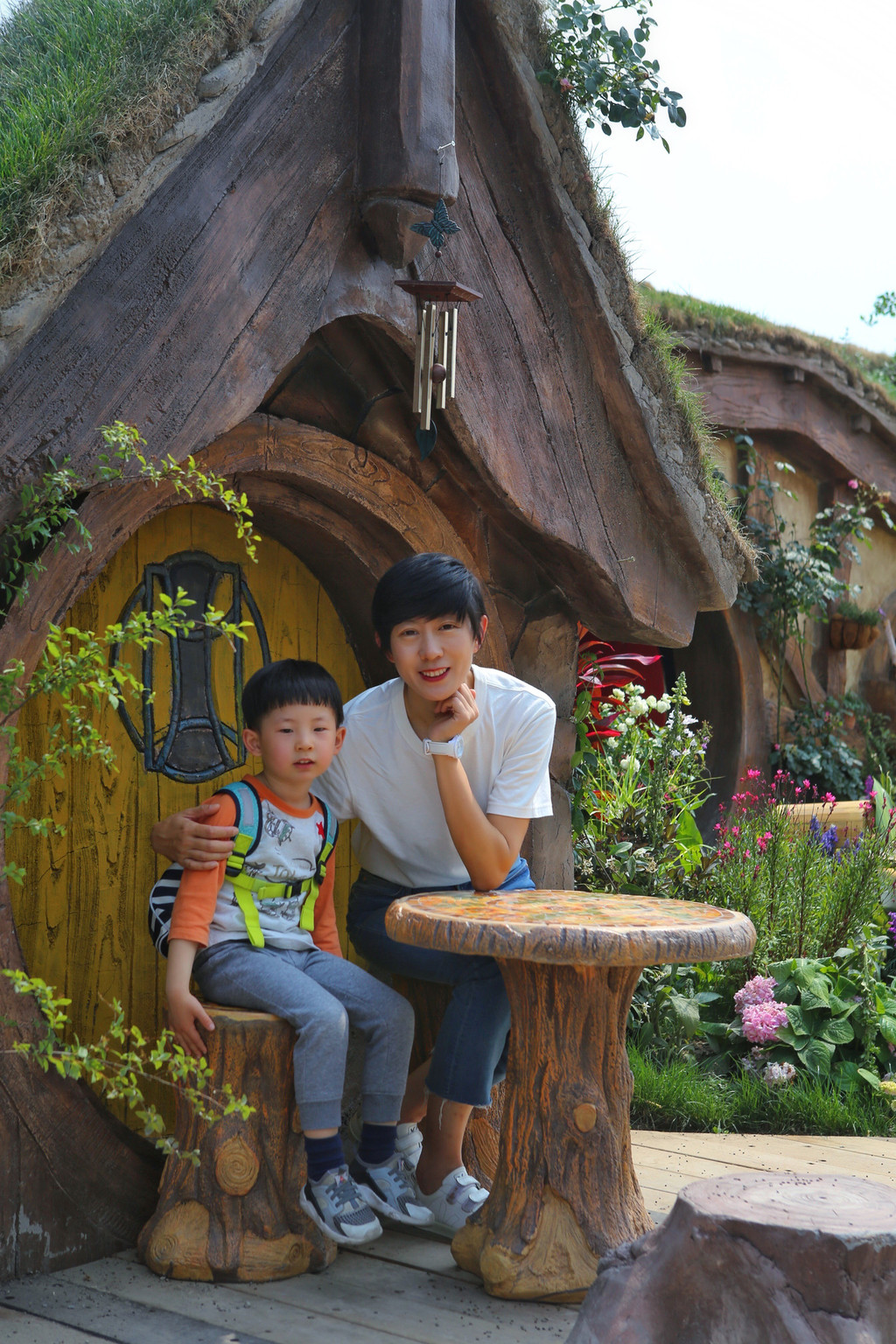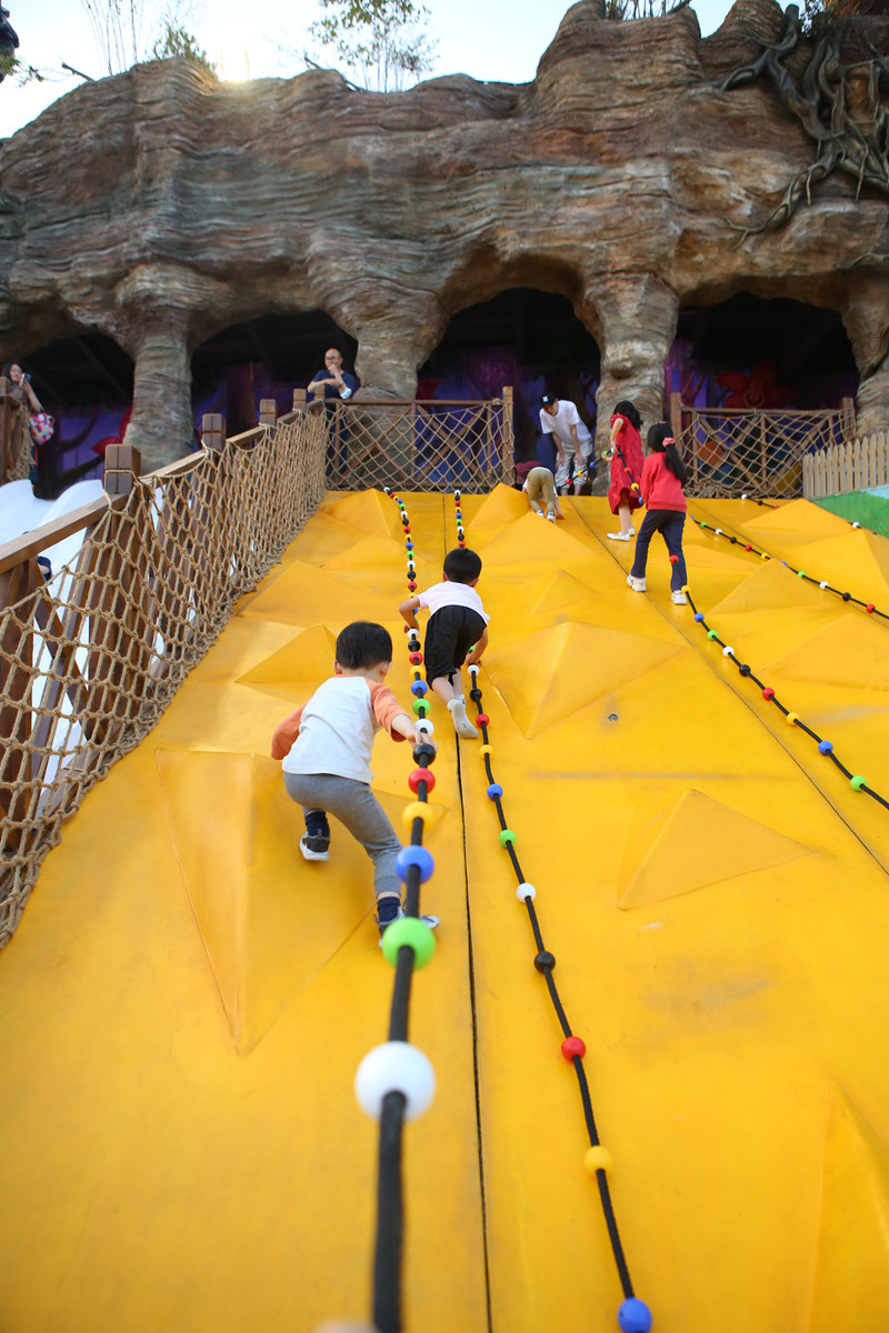走过悬空木桥,来到顶层的精灵谷,这还原了霍比特人小屋,圆形的木门,石板铺就的小路,颇为梦幻;霍比特人小屋对面是几个超嗨的巨型滑梯,孩子们在这里攀爬并体验着速度带来的快乐感觉,激动的真真尖叫;下午的小丑表演也在这。