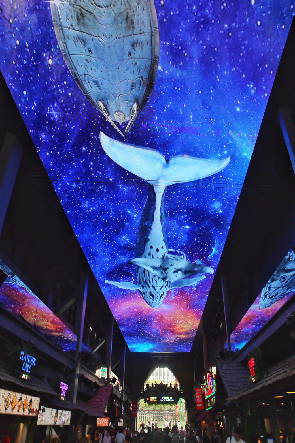 而魔幻街则位于宋城的一层,这里抬头可见酷炫的头顶巨幕,各种海洋动物游弋、还有长着翅膀的老虎、飘飘洒洒的樱花。这里有美食拍档,累了在这休息一下,吃点东西。这里的还有颇为怀旧的“童年小卖部”,特有教育意义的《战火》体验也在这层。