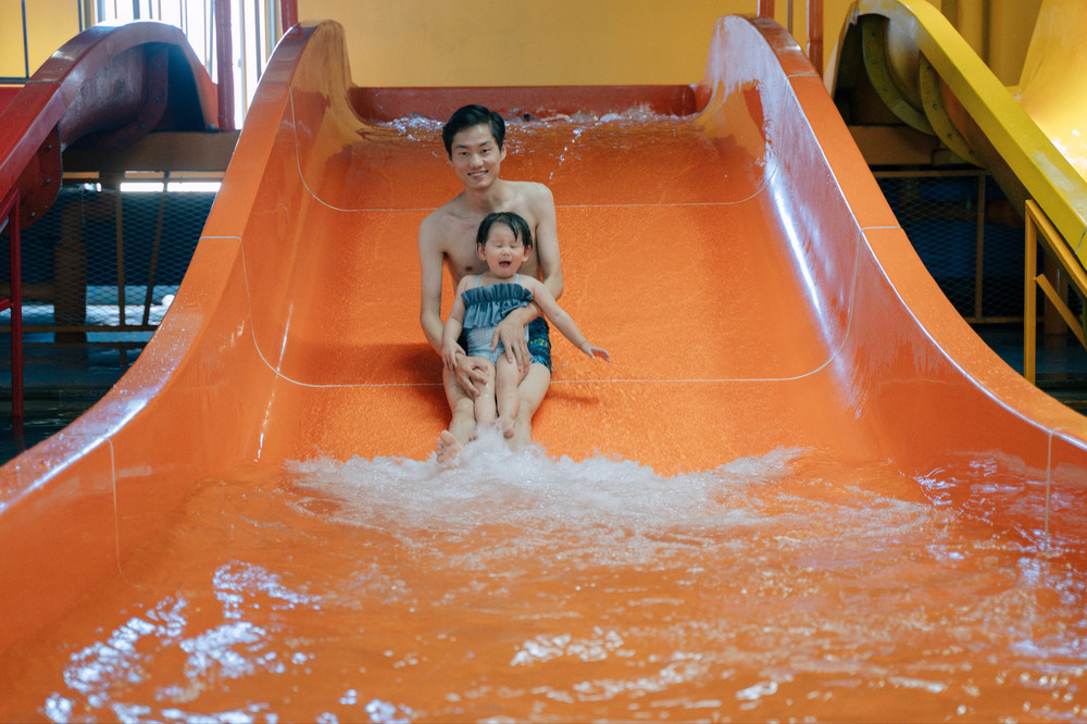水乐园的儿童戏水区还是非常大的,沿着滑梯区呈U字型的分布,这里也有坡度较缓、长度较短适合儿童的水上滑梯,抱着云宝,从上滑下,云宝开心的最后直接躺在了我的身上。