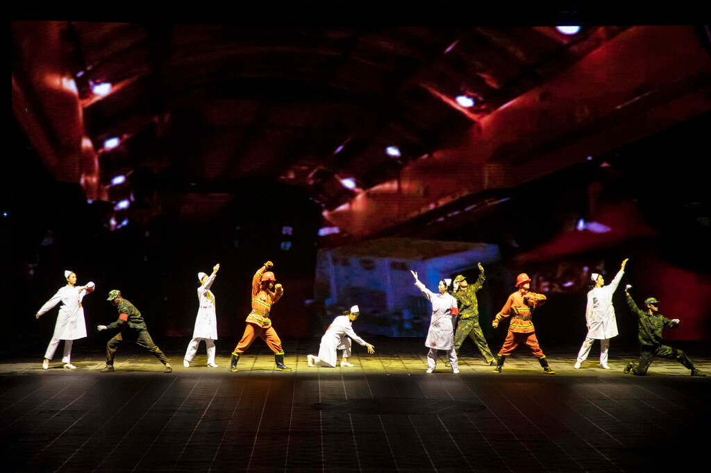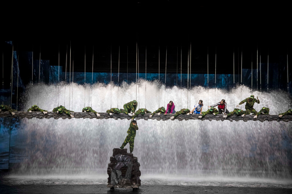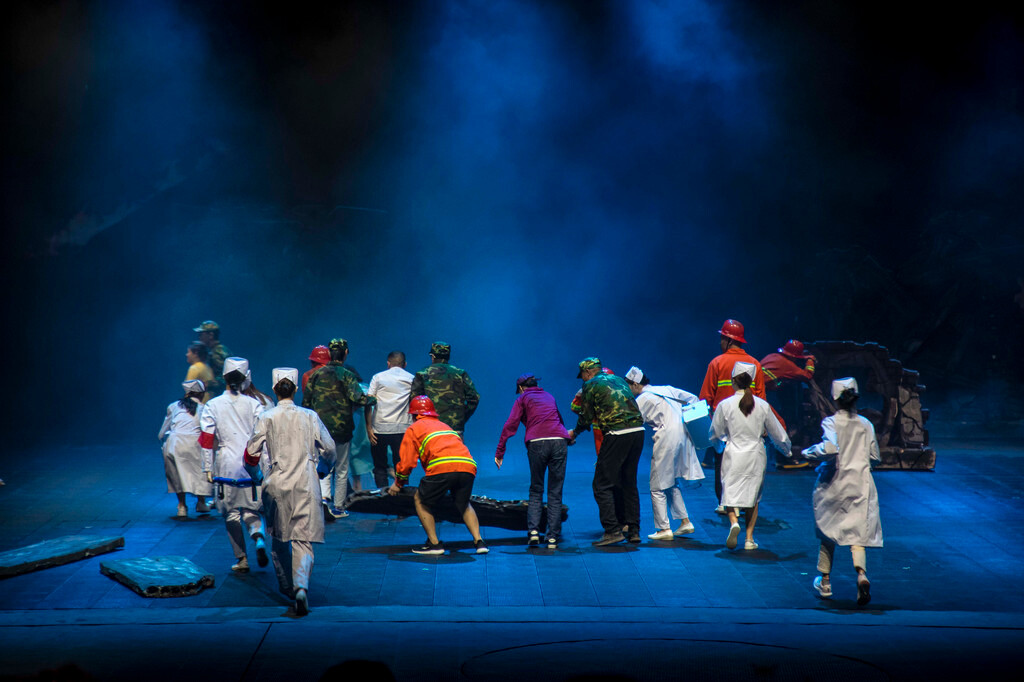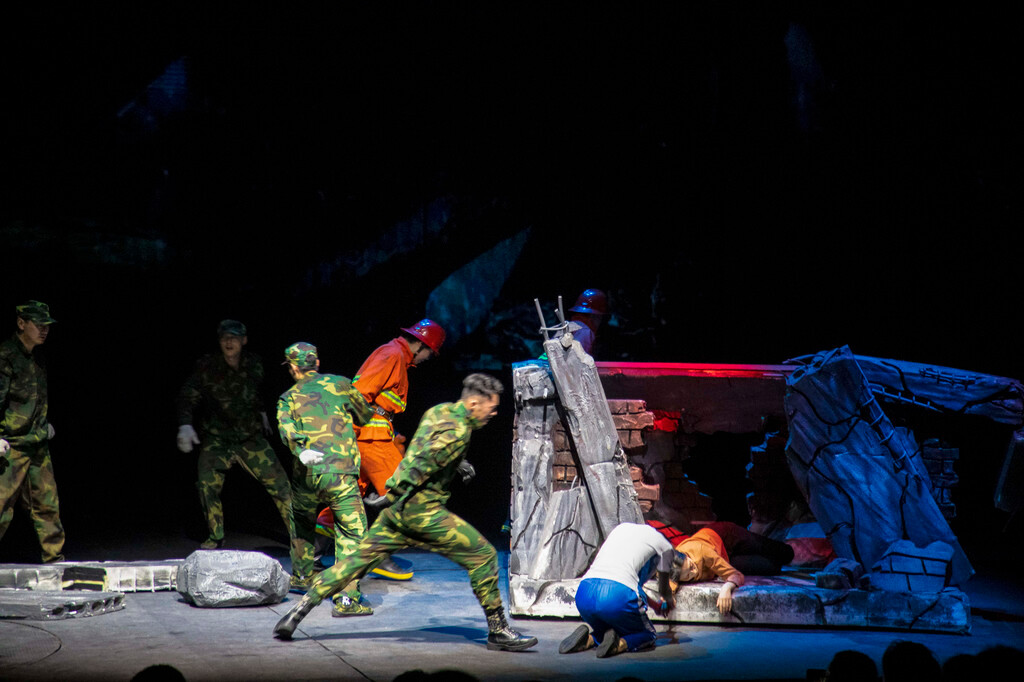情景剧通过演员生动的表演和现场的特技特效,真实再现了汶川地震的悲惨场景,滑坡、地裂缝和房屋倒塌,地震时洪水瞬间倾泻而下。情景剧表达了中华民族对抗震救灾的大爱无疆。
