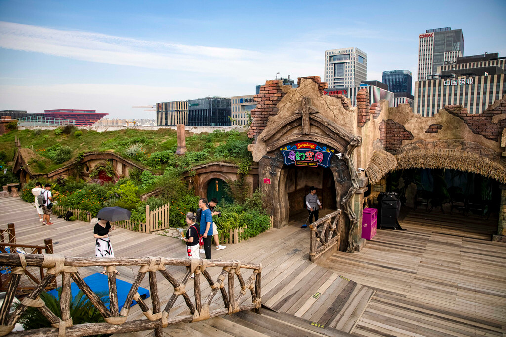 进入上海宋城便上到了最高层,这里有可以将上海风光一览无余的的观景台,也有小朋友们超喜爱的彩虹滑道,宋城在高楼林立的城市中打造了一个魔幻的异次元空间—精灵谷,精灵谷中最有特色的要属霍比特人小屋了。