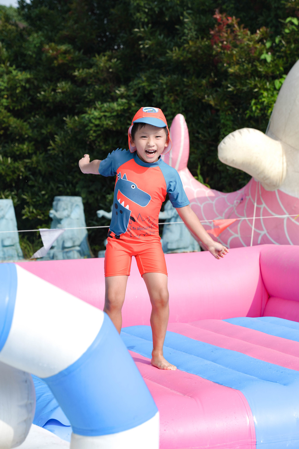 现场还有很多小小孩不知疲倦的挖沙子,仿佛在挖一个心中的梦幻城堡,元宝似乎已经过了挖沙子的年纪,更享受水上乐园的闯关挑战。