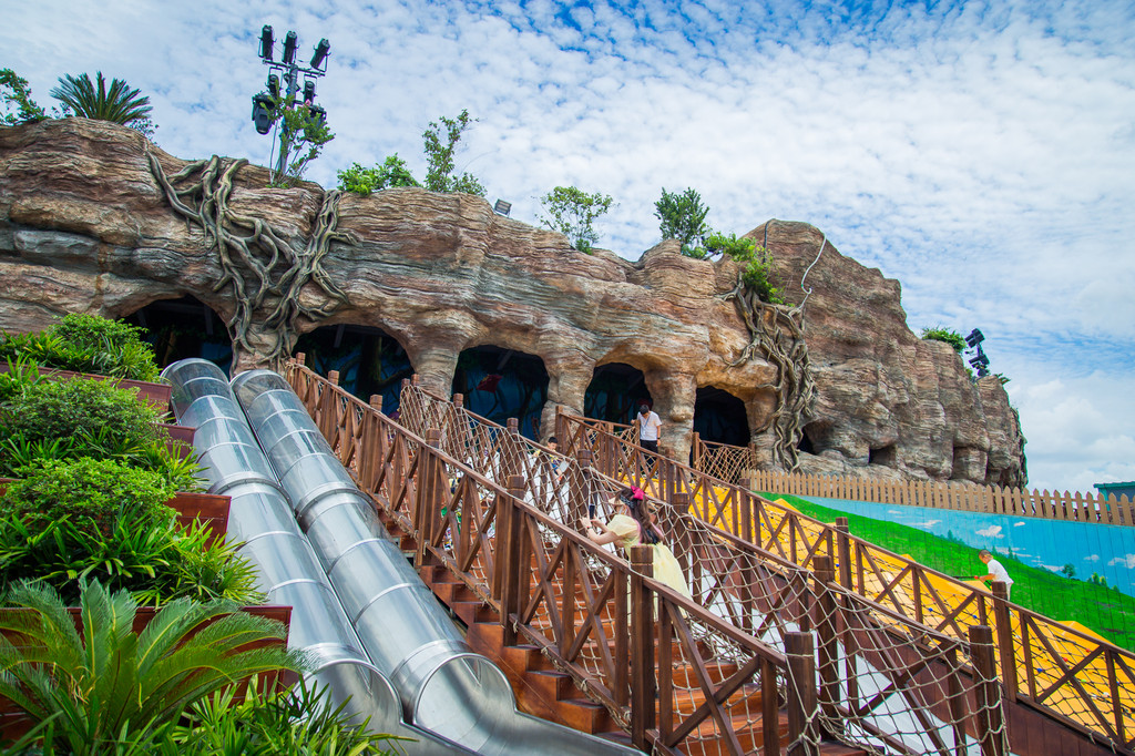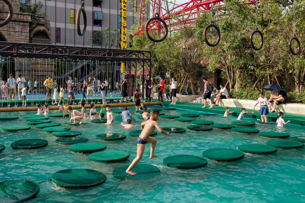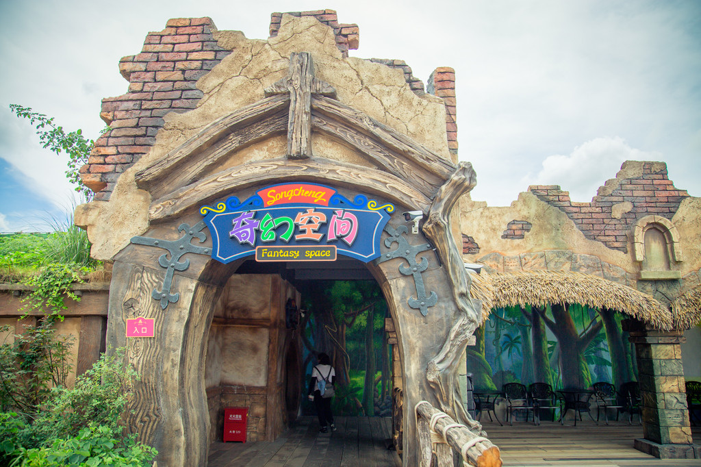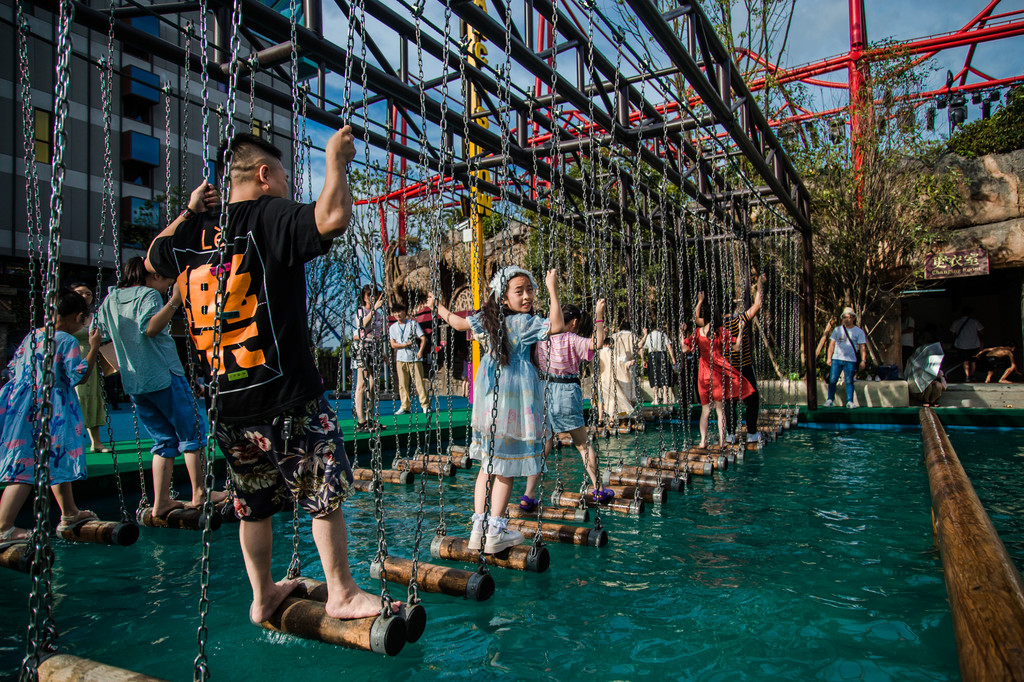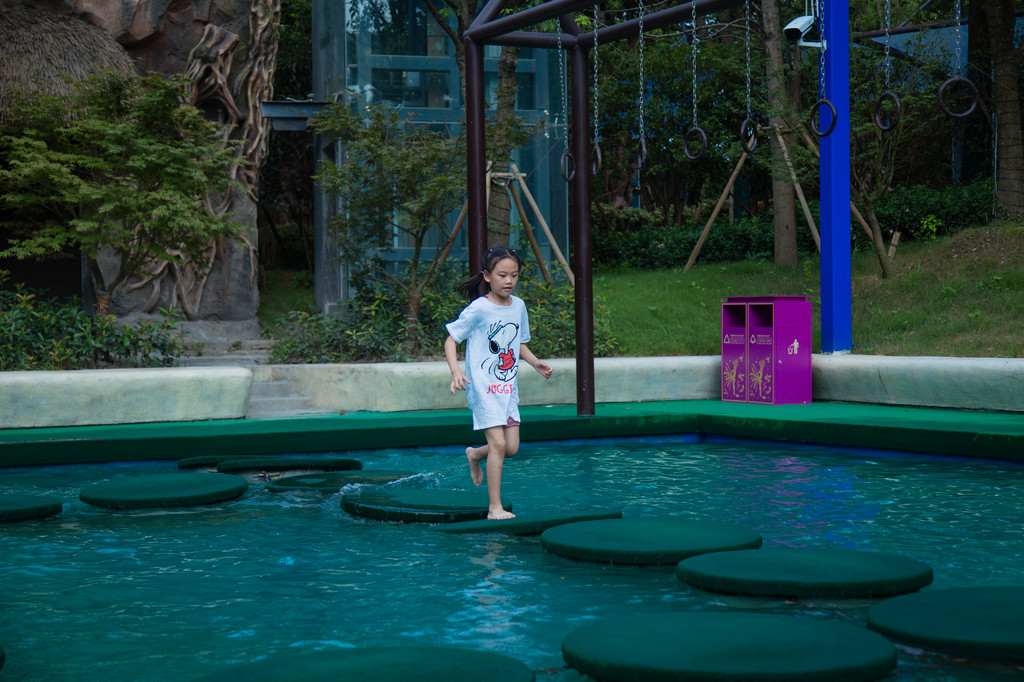 走过一楼的穿越街,又穿过魔幻街,是室外的音乐广场和彩色森林,当然还有小朋友们都爱的戏水池,挑战自我的时候到了,独木桥,水上漂,铁索木桩,一不小心就会落水,但在这里,每个游客脸上几乎都显露着笑容。记得要多带一套衣服哦!
