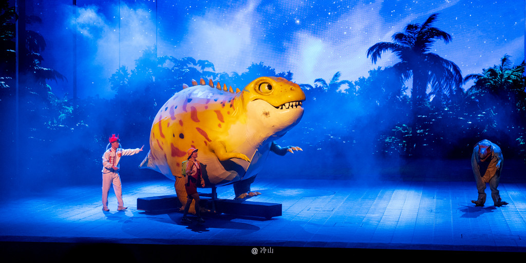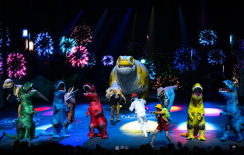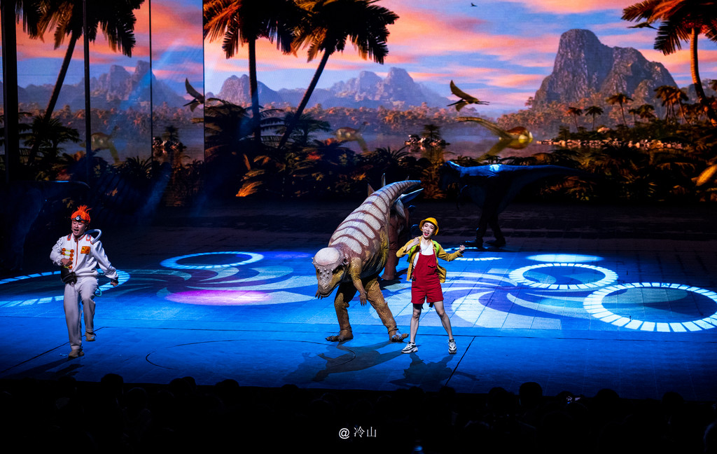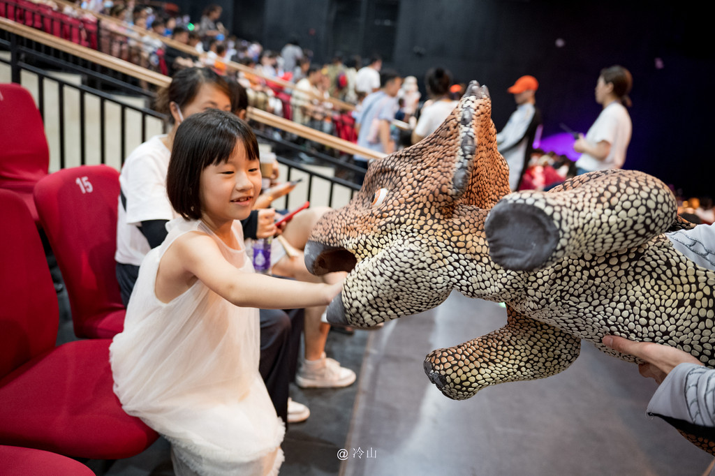 演出开始前,几只恐龙就出现在观众面前,电影里身躯庞大的恐龙,化身为萌兽,小朋友也开心的与它们互动起来,气氛正好。