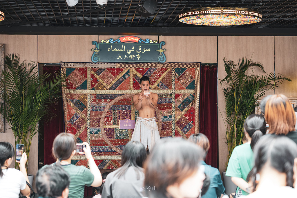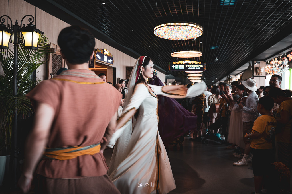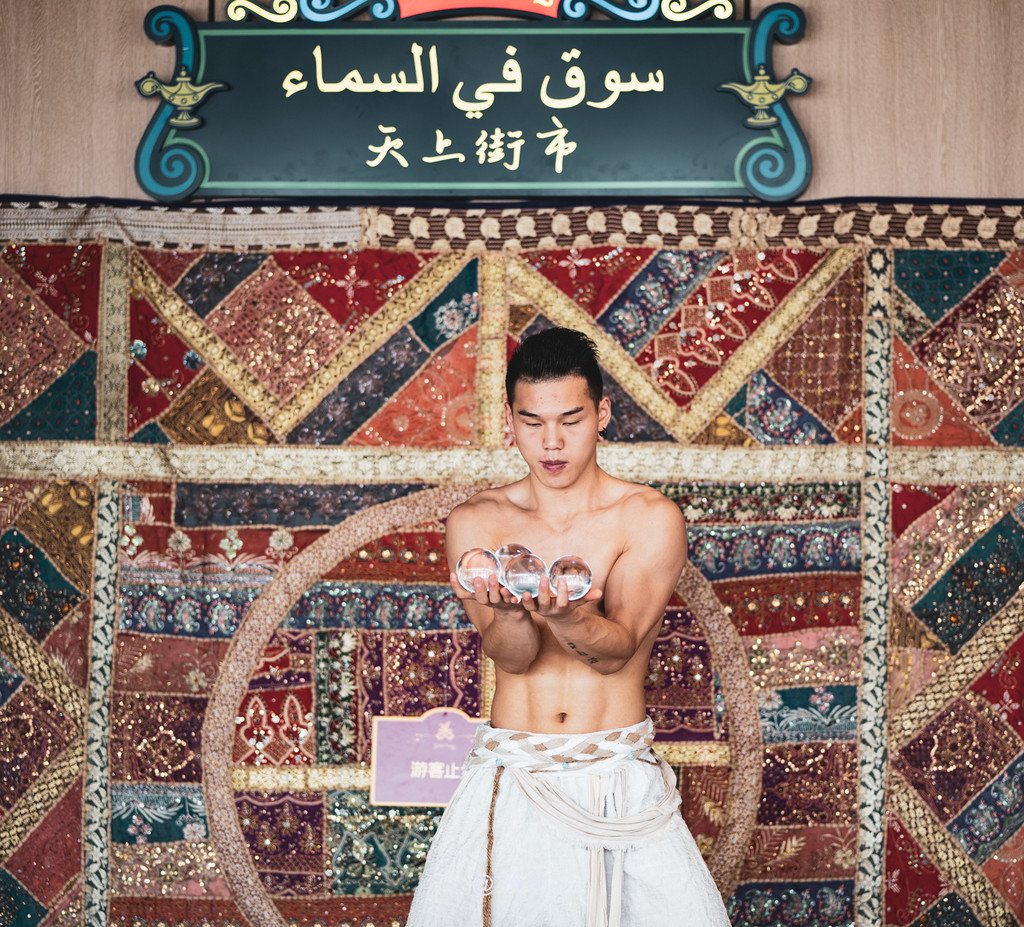 神灯广场上的神灯快闪也是一场不容错过的互动演出,身着异域服装的演员在神灯广场上翩翩起舞,就像他们在街市上散步一般。我们也仿佛瞬间来到了异国,热情的舞者还会邀请游客加入他们的队伍,几分钟的快闪时间,引燃了一条街的热情。