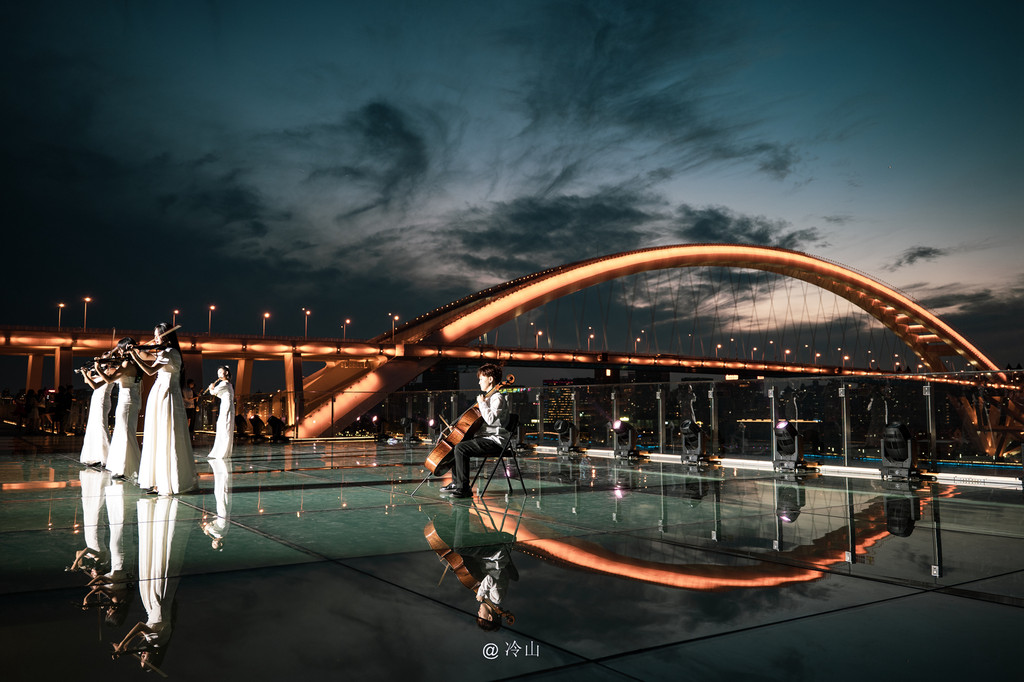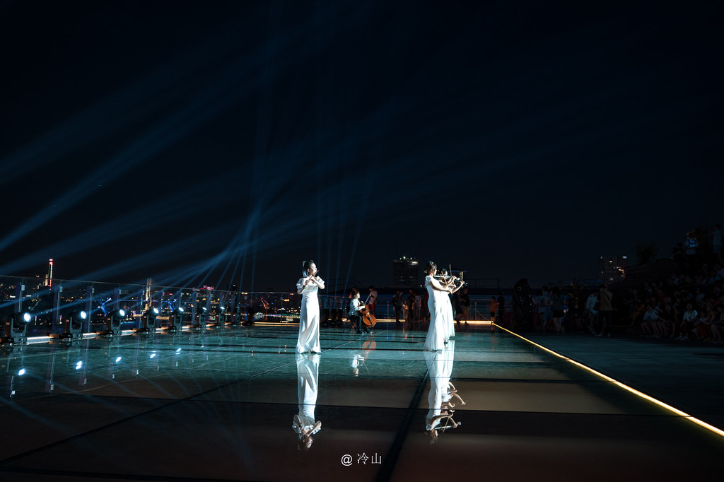 华灯初上,悬崖音乐会在暮色中拉开序幕,优美动听的乐曲,伴着悠悠黄浦江水,在城市绚丽灯光中旖旎着,令人沉醉。