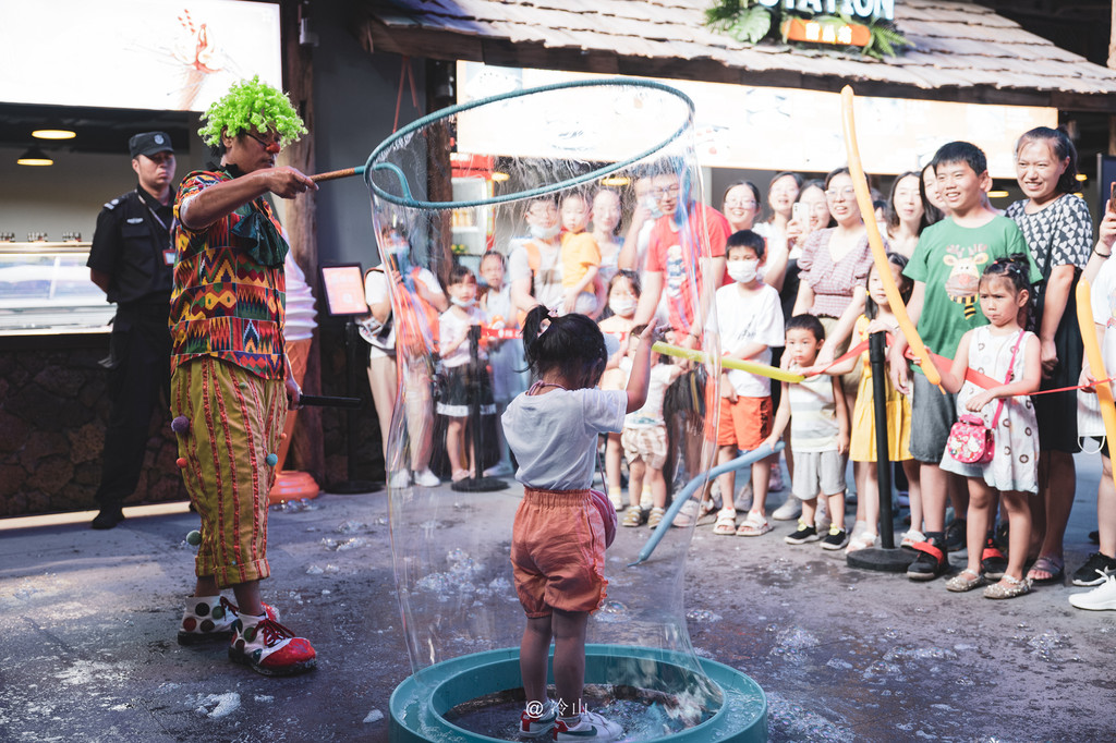 小朋友找到的第一个精彩演出就在魔幻街一楼的《魔幻泡泡》,表演时间是15分钟。小丑打扮的演员用泡泡演绎一个个精彩的瞬间,小朋友们最爱的当然是有机会上台和表演们一起表演,你看他们手举得多高。一个个充满梦幻气息的泡泡,带来很简单的快乐。