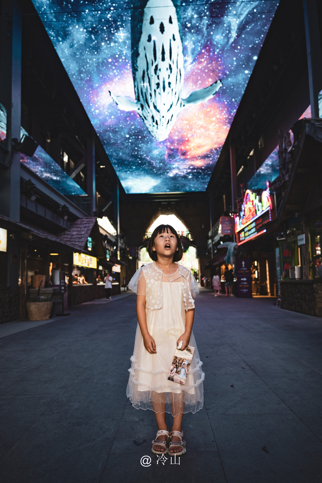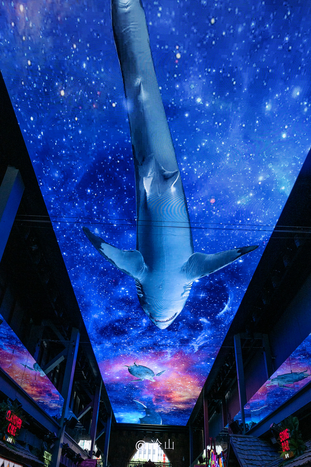 参与过了神奇的魔幻泡泡秀,我们来有时间感受魔幻街的梦幻。抬头是梦幻的天幕,影像不停的变幻着,开满鲜花的绿色森林,长着漂亮翅膀的老虎在自由行走;星辰大海在天幕上呈现出魔幻的科技美感,看那鲸鱼遨游在天际,引来阵阵惊叹。