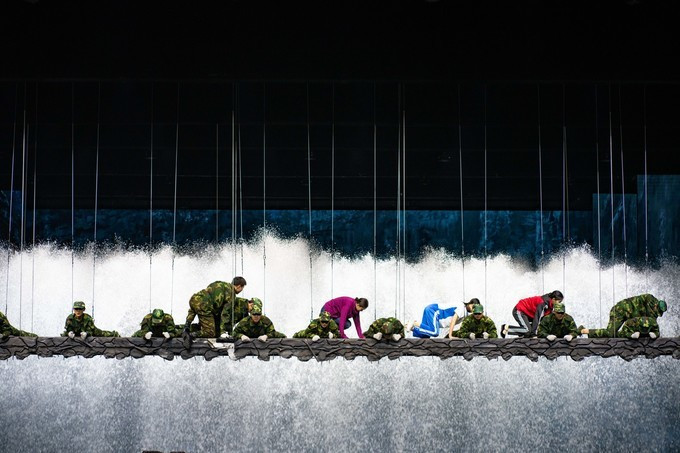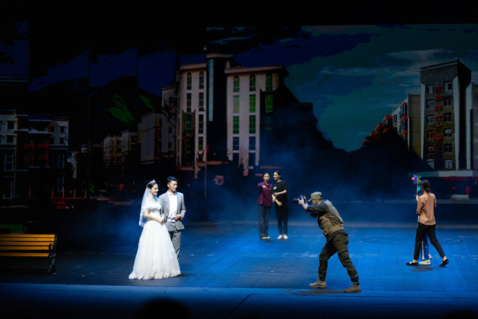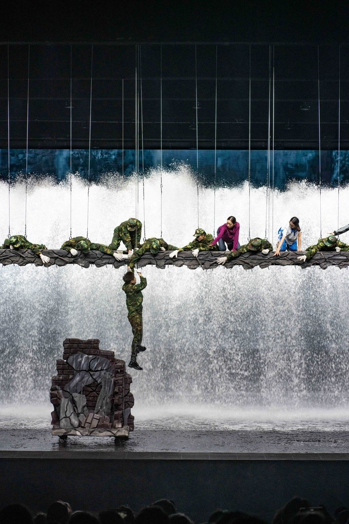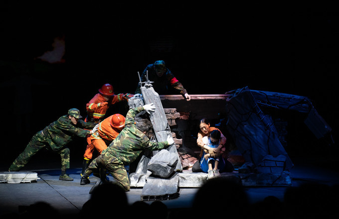 演出采用倒叙的形式,先是一名摄影师讲述了自己当时给一对新人拍摄婚纱时候的场景,接着就是女孩子出来回忆自己的母亲,在地震时,是如何保护保下她的,然后整个演出才算正式开始。