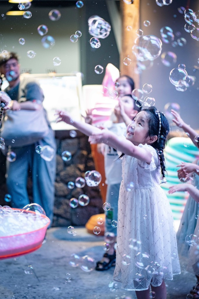 让我们这样的大人,都情不自禁的停下脚步,细细观赏起来。当然也有大人们喜欢这样的魔幻泡泡,也走进去当一次模特,当那个又大又长的泡泡将模特罩住的时候,每个人的脸上都出现惊呼的表情,真的很有趣,很生动。