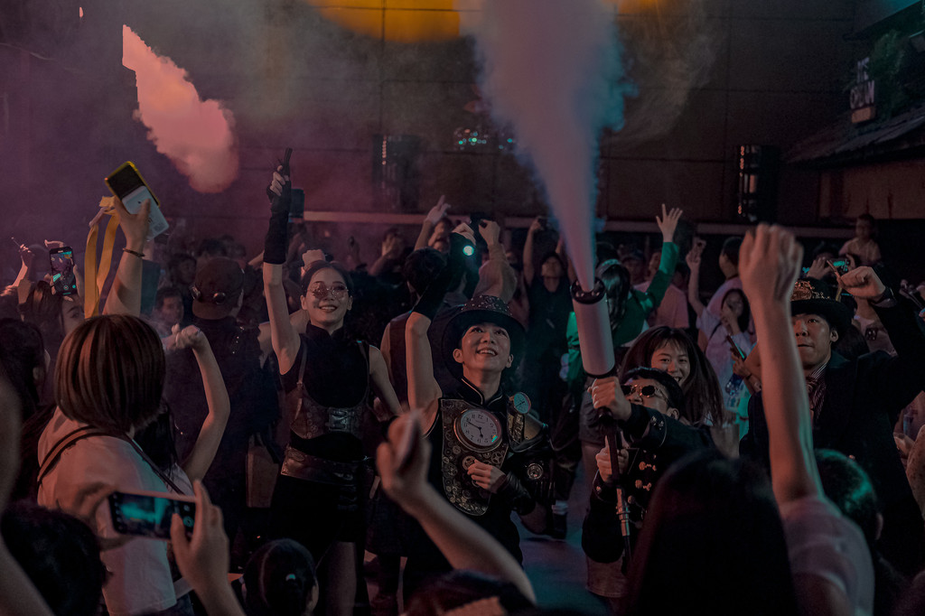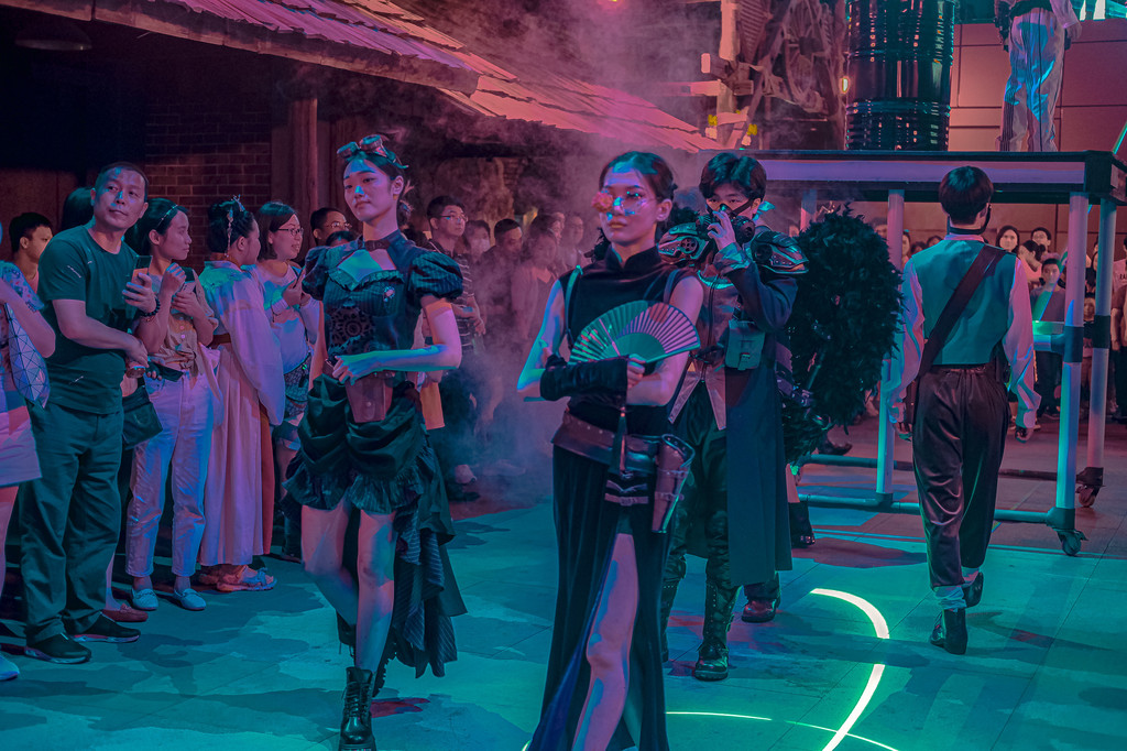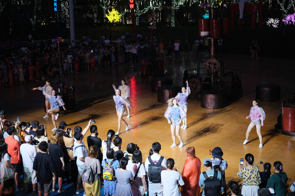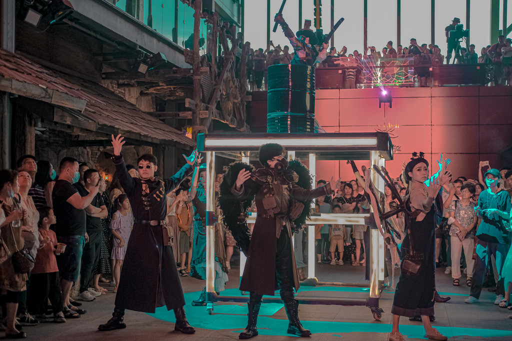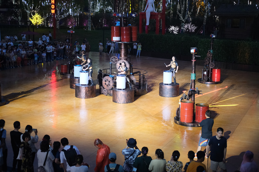 演出前几分钟,景区内的人流就从四面八方往魔幻街聚拢,时间一到,一帮身穿朋克风服装的演员就不知从何处推着金属架子往魔幻街中间跑去,他们利用灯光、音响、烟雾、特效,以及朋克风的夸张服装,来为我们现场打造了一个充满未来科技感的世界,让站在演出现场的我们,宛若走入一个时空交错的五维空间,为我们带来非一般的视觉享受。演出过程中,我们还能跟自己喜欢的演员一起合照,演出最后在场的所有人就慢慢聚拢在一起,跟着灯光与音乐在烟雾笼罩的魔幻街尽情摇摆。