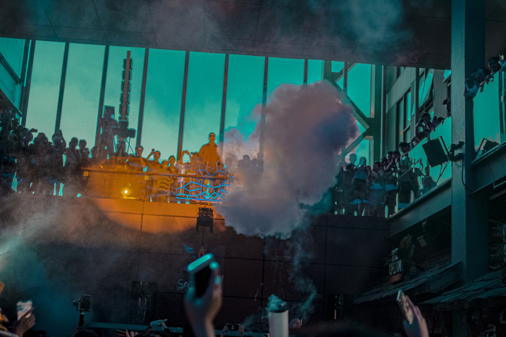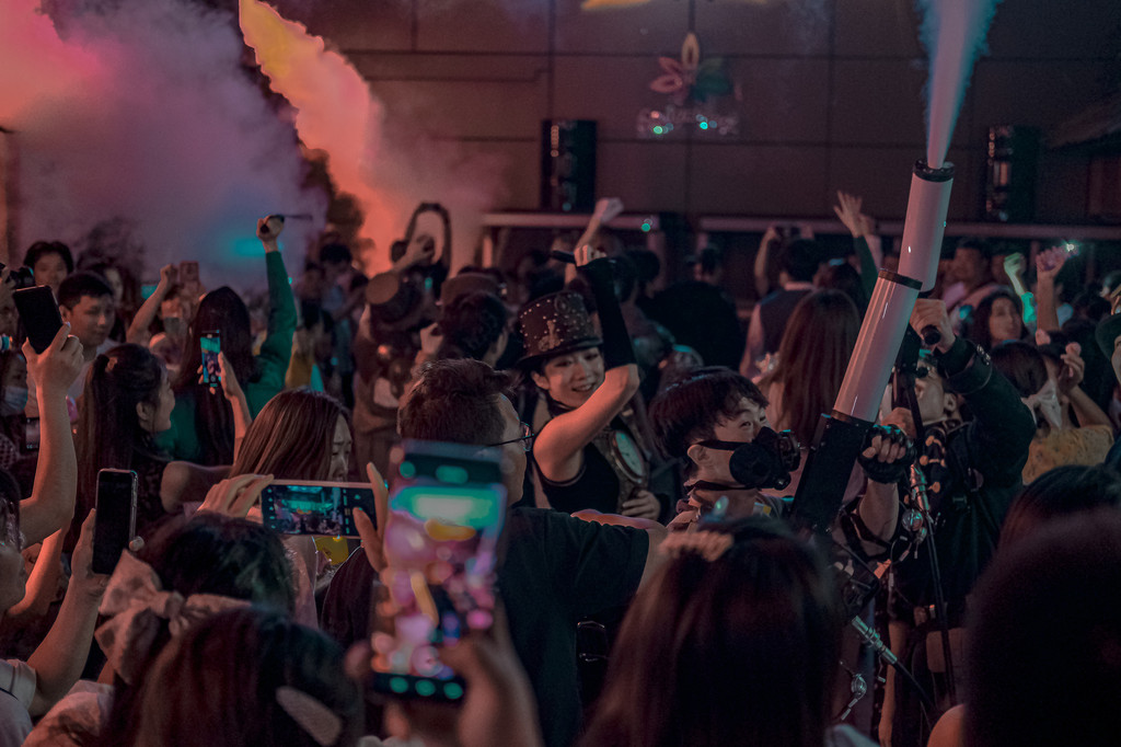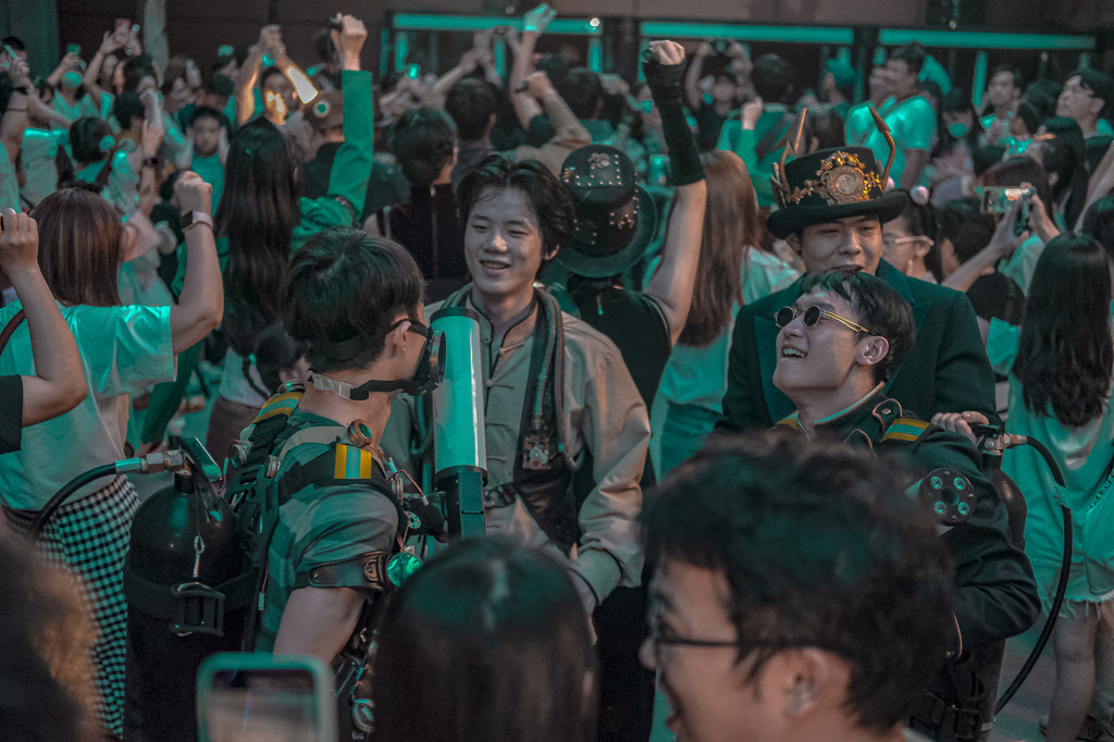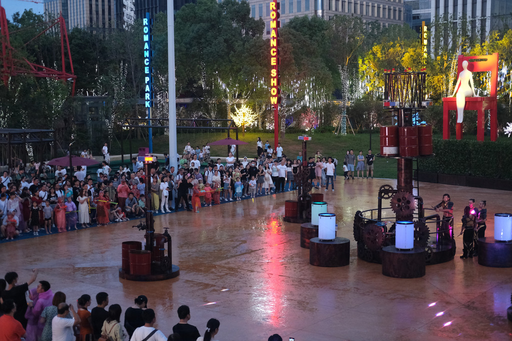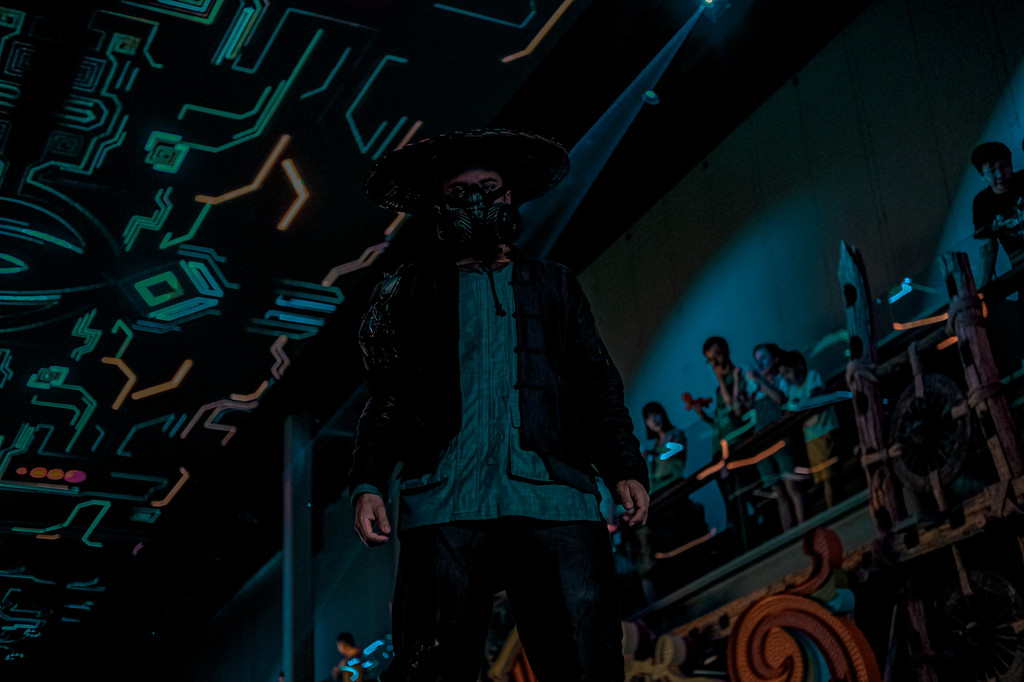 演出前几分钟,景区内的人流就从四面八方往魔幻街聚拢,时间一到,一帮身穿朋克风服装的演员就不知从何处推着金属架子往魔幻街中间跑去,他们利用灯光、音响、烟雾、特效,以及朋克风的夸张服装,来为我们现场打造了一个充满未来科技感的世界,让站在演出现场的我们,宛若走入一个时空交错的五维空间,为我们带来非一般的视觉享受。演出过程中,我们还能跟自己喜欢的演员一起合照,演出最后在场的所有人就慢慢聚拢在一起,跟着灯光与音乐在烟雾笼罩的魔幻街尽情摇摆。